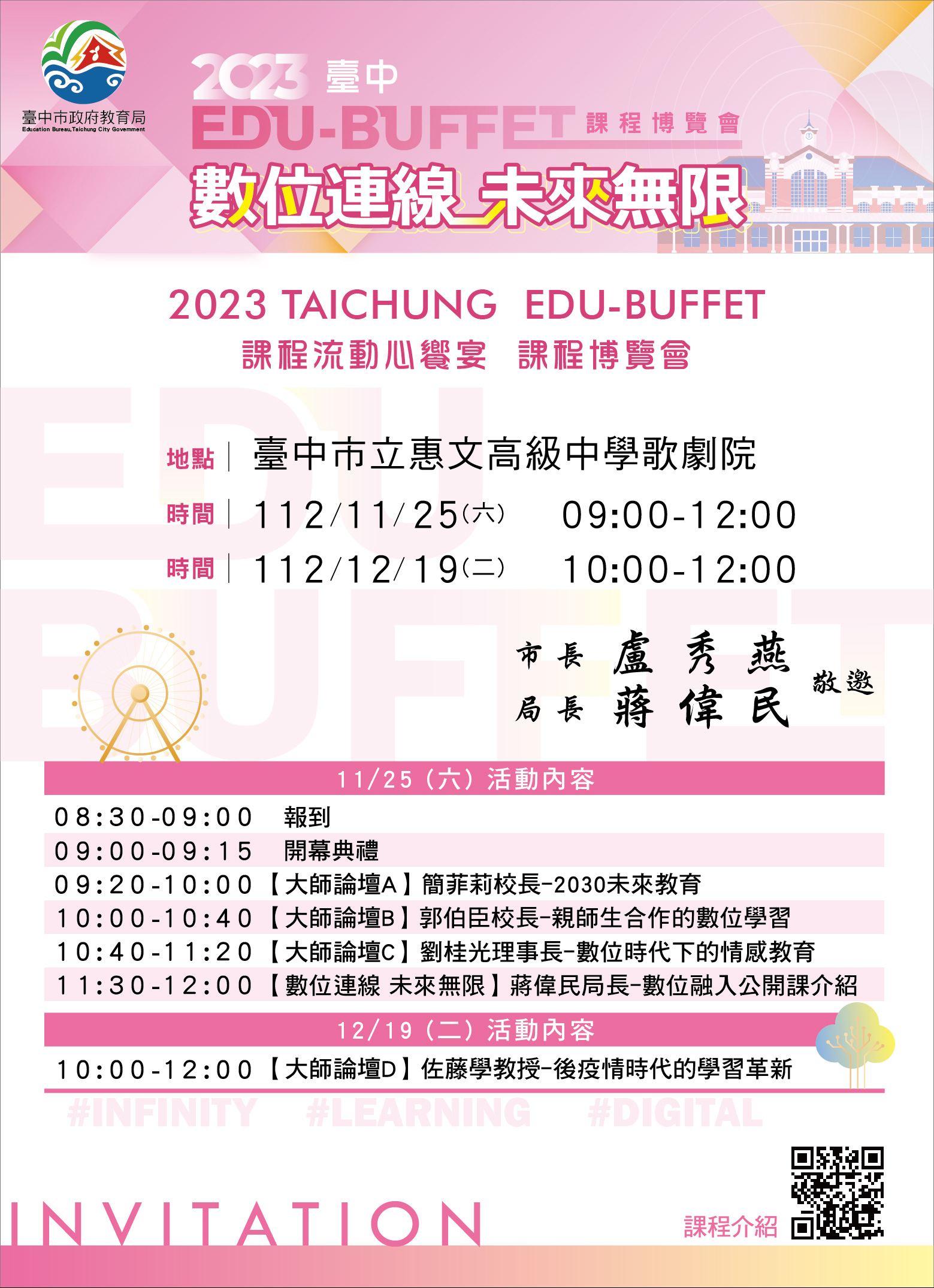 二、2023臺中EDU-BUFFET課程博覽會以「數位連線 未來無限」為主題,期待與各縣市學校、教師及家長們,共同交流課程研創與數位融入教學實踐之經驗,歡迎教育夥伴共襄盛舉,體驗臺中多元豐富教育力。