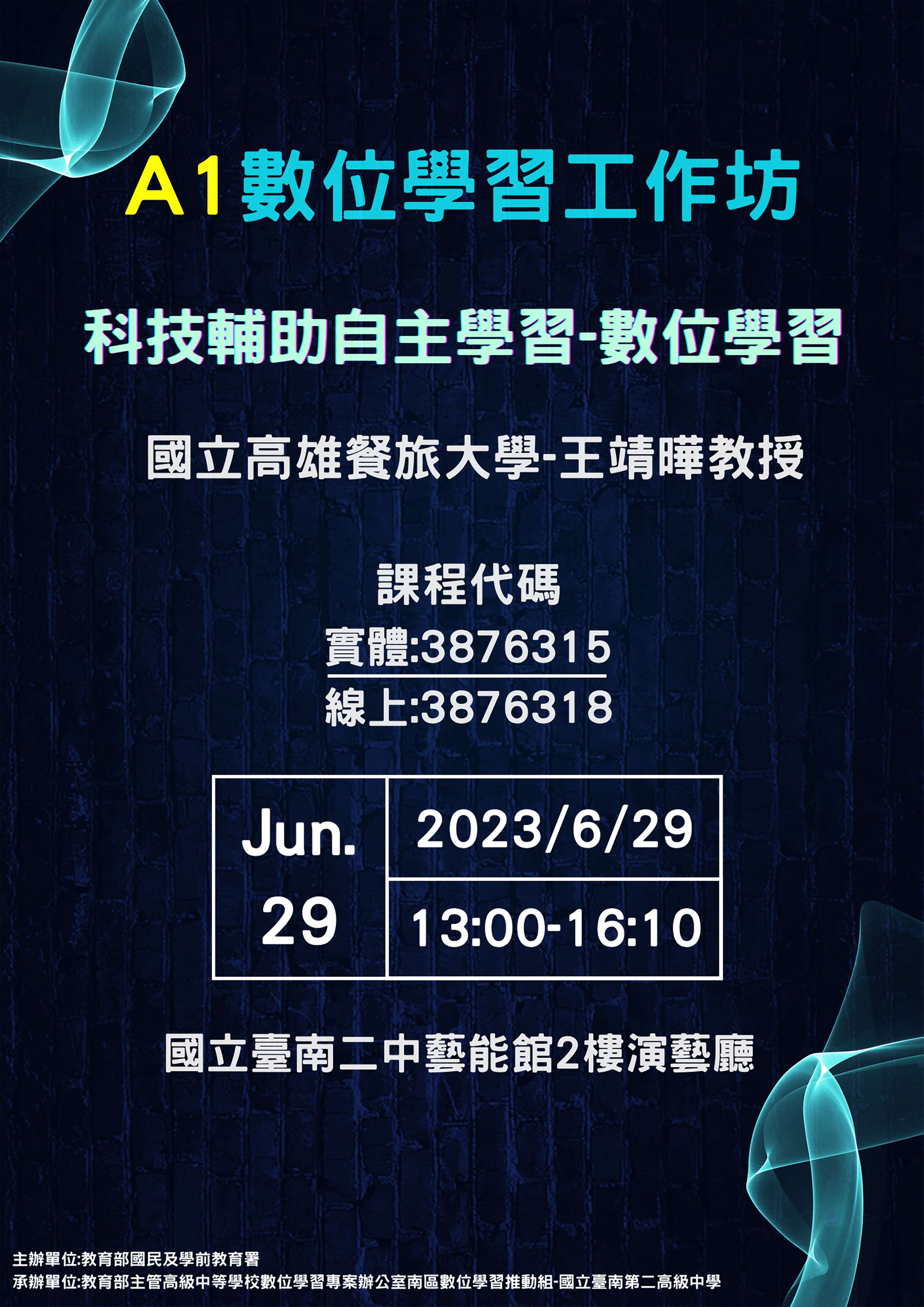 1、實體課程:國立臺南第二高級中學藝能館2樓演藝廳(臺南市北區北門路二段125號)。