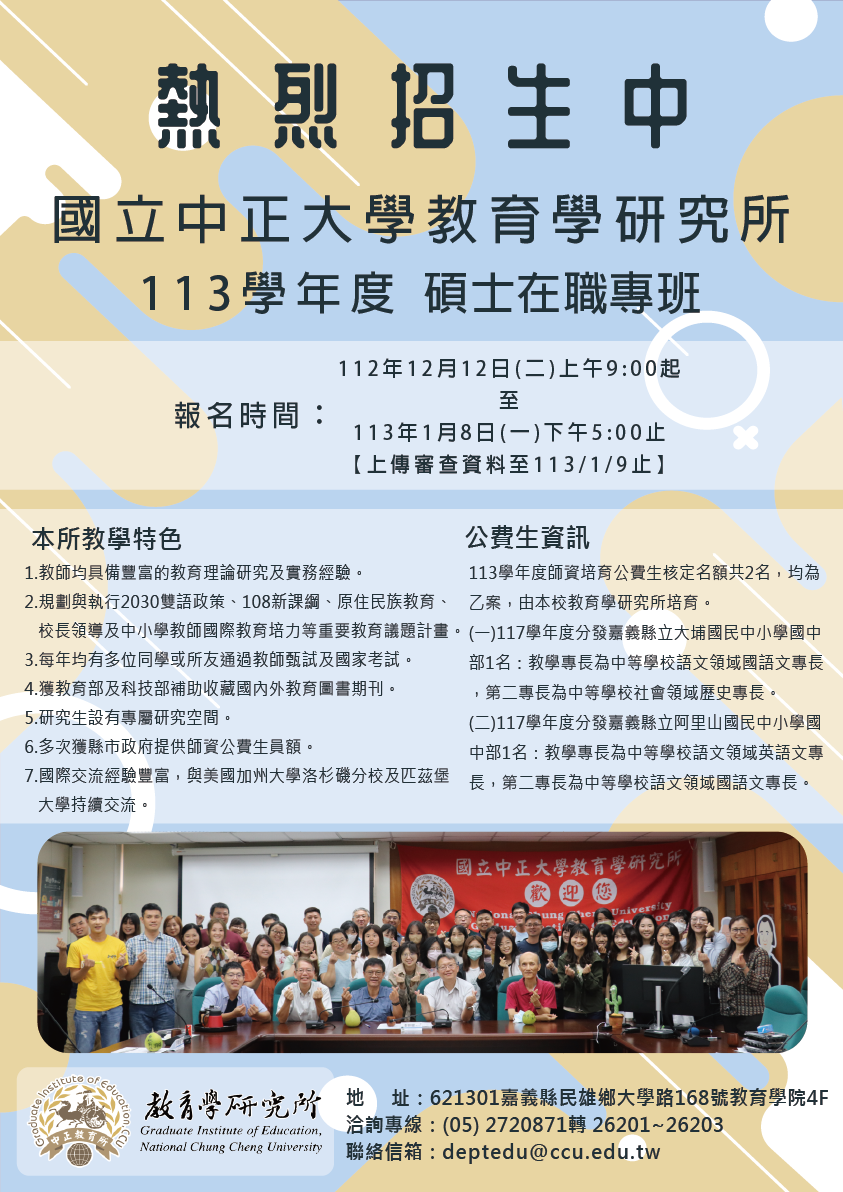 一、113學年度碩士在職專班報名日期為112年12月12日上午9時起至113年1月8日下午5時止【上傳審查資料至113年1月9日止】。