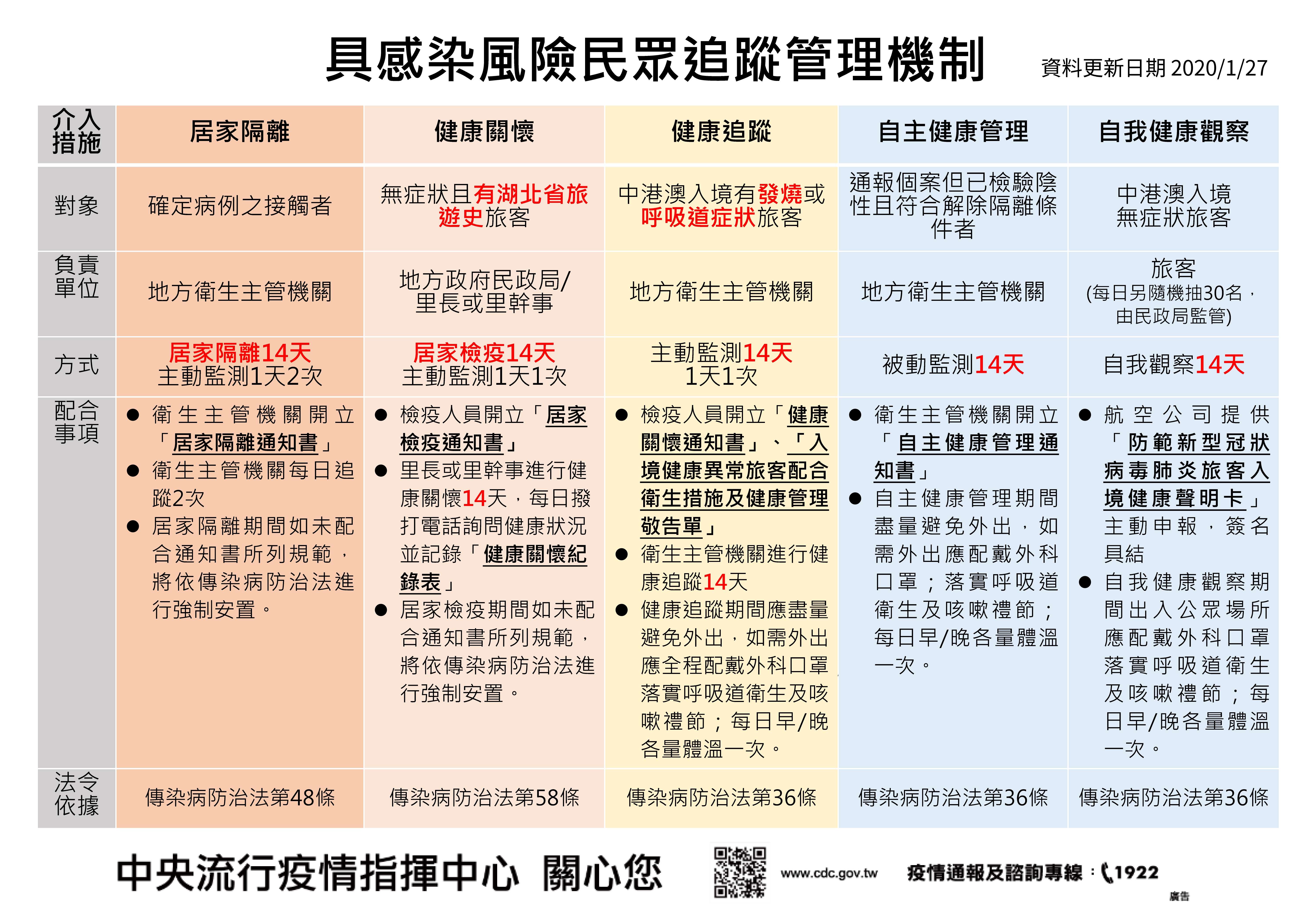 四、檢附疫情指揮中心本年1月27日公佈之武漢肺炎「具感染風險民眾追蹤管理機制」表1份供參。