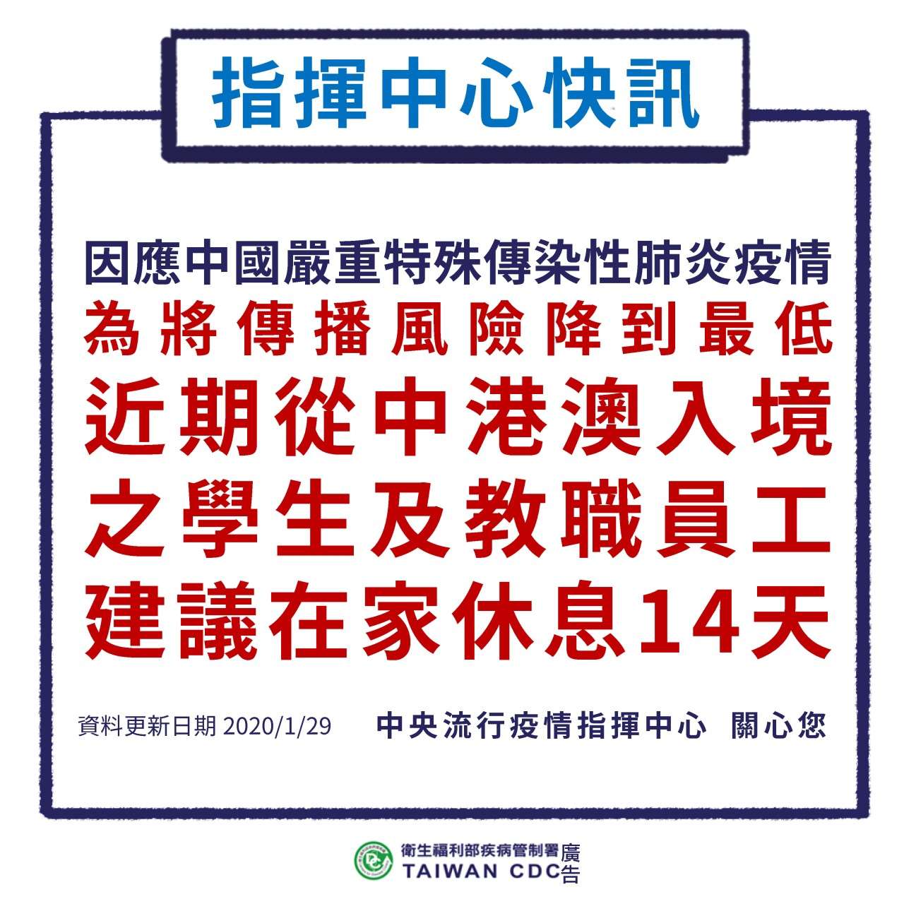 3.自1/30日起,要求教職員工、親師生及進出入校園廠商、訪客配戴口罩,同時守衛室亦會為訪客測量登錄體溫,如發現發燒或疑似症狀禁止進入校園。