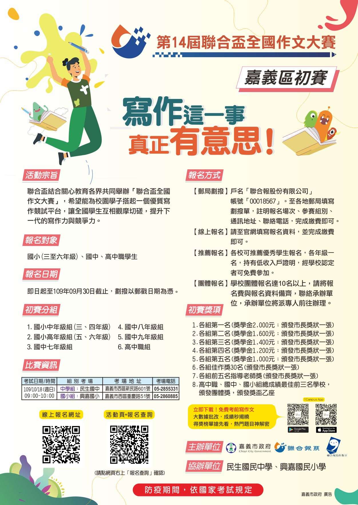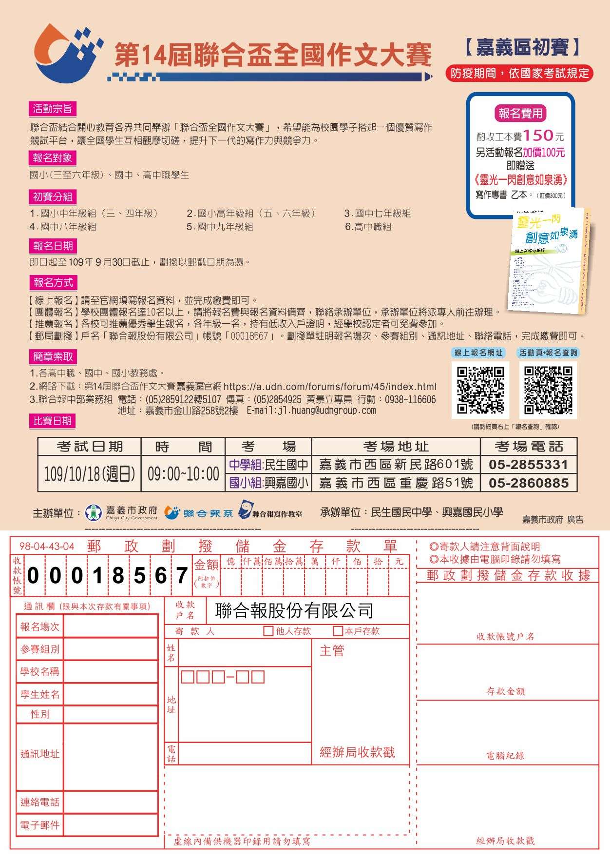五、比賽地點:嘉義市立民生國中及嘉義市興嘉國小(以准考證