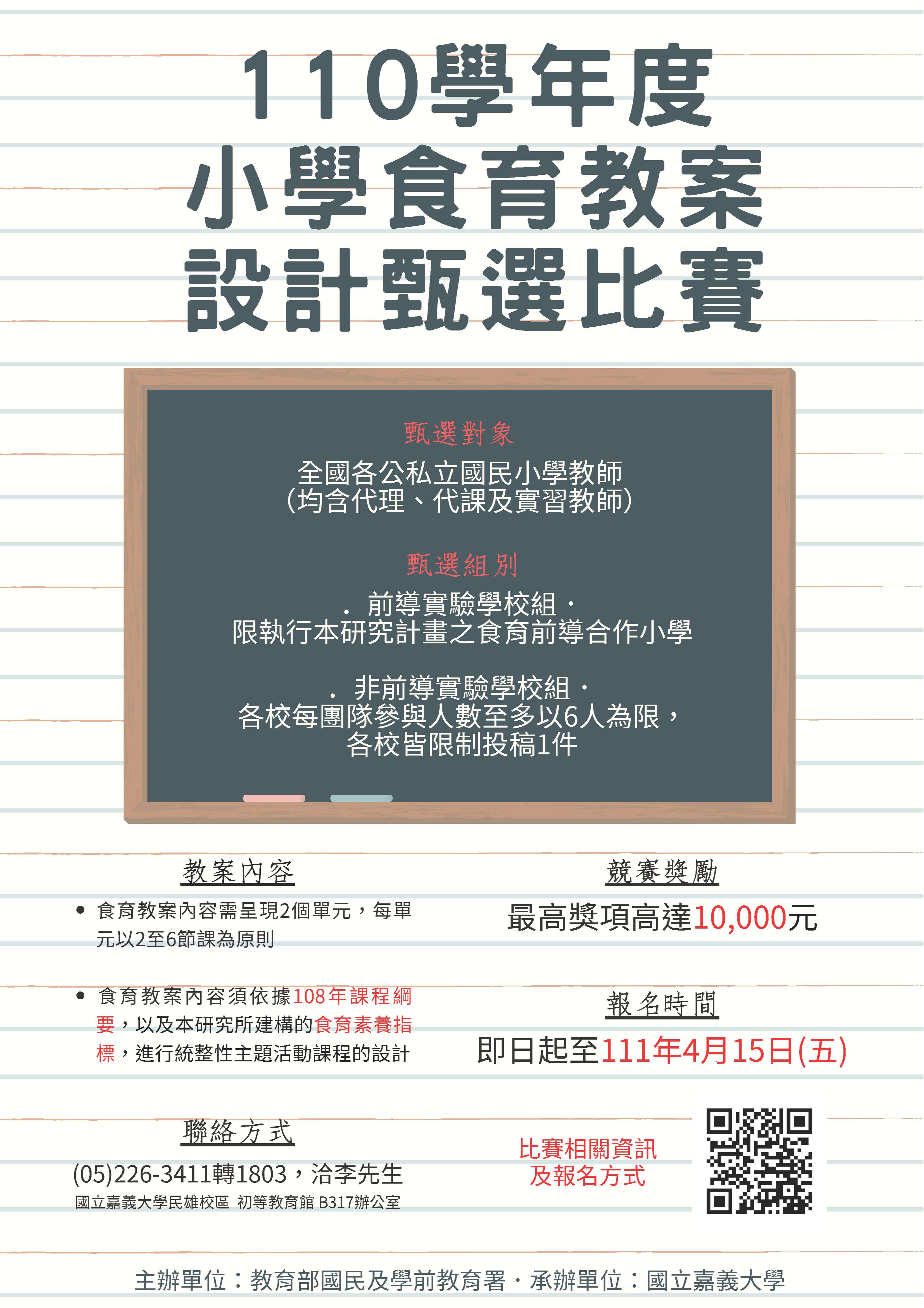 主旨:教育部委託國立嘉義大學辦理「110學年度小學食育教案設計甄選比賽」,請各校踴躍報名參加,請查照。