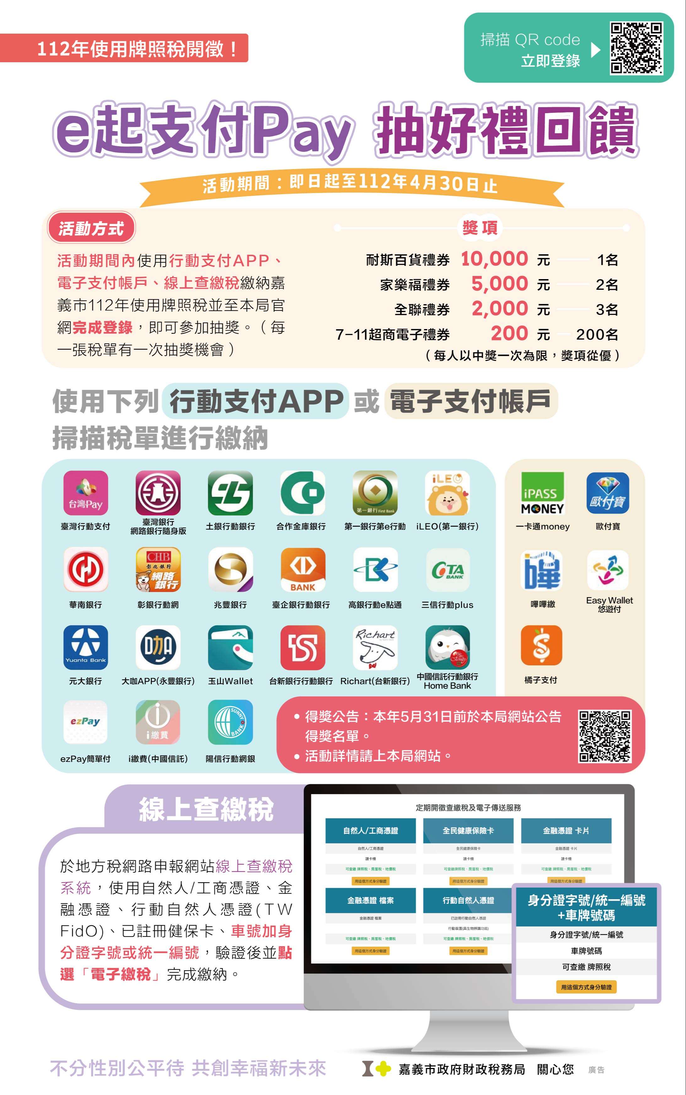 (二)「e起支付Pay抽好禮回饋」,4月30日前以行動支付APP、電子支付帳戶或線上查繳稅繳納使用牌照稅並至市