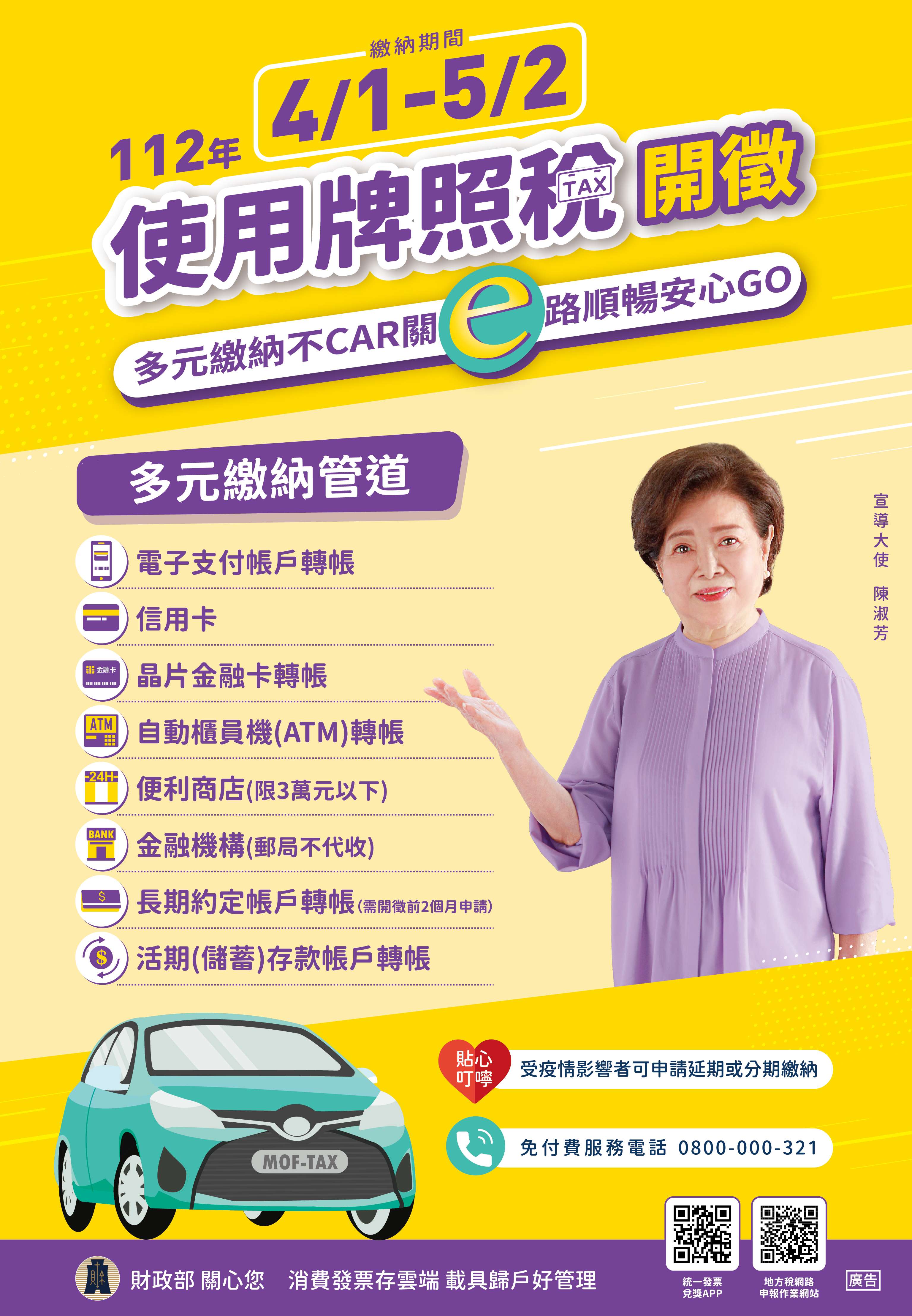 一、隨函檢附112年使用牌照稅開徵宣導海報及活動DM電子檔各