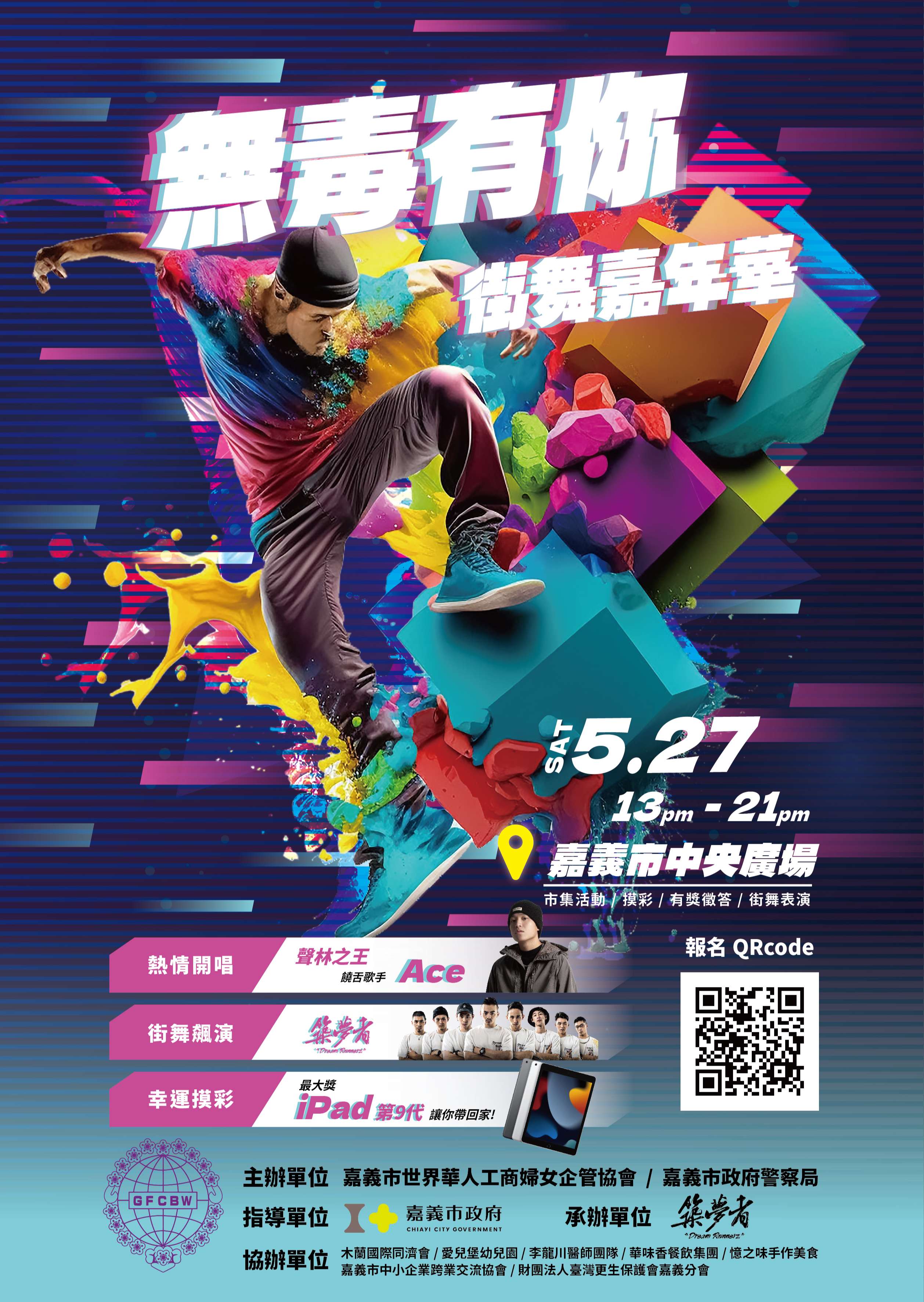 主旨:112年5月27日本府警察局與世界華人工商婦女企管協會嘉義分會共同辦理「無毒有你-街舞嘉年華」活動,請協助運用多元管道加強宣傳並鼓勵校內學生踴躍參加。