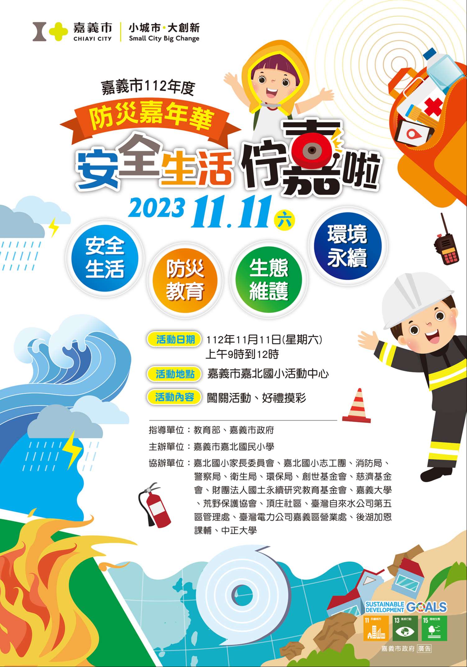 主旨:嘉北國小辦理「嘉義市112年度防災嘉年華-安全生活闖關活動」實施計畫及海報電子檔各乙份(如附件),請貴校(園所)協助公告鼓勵參加。