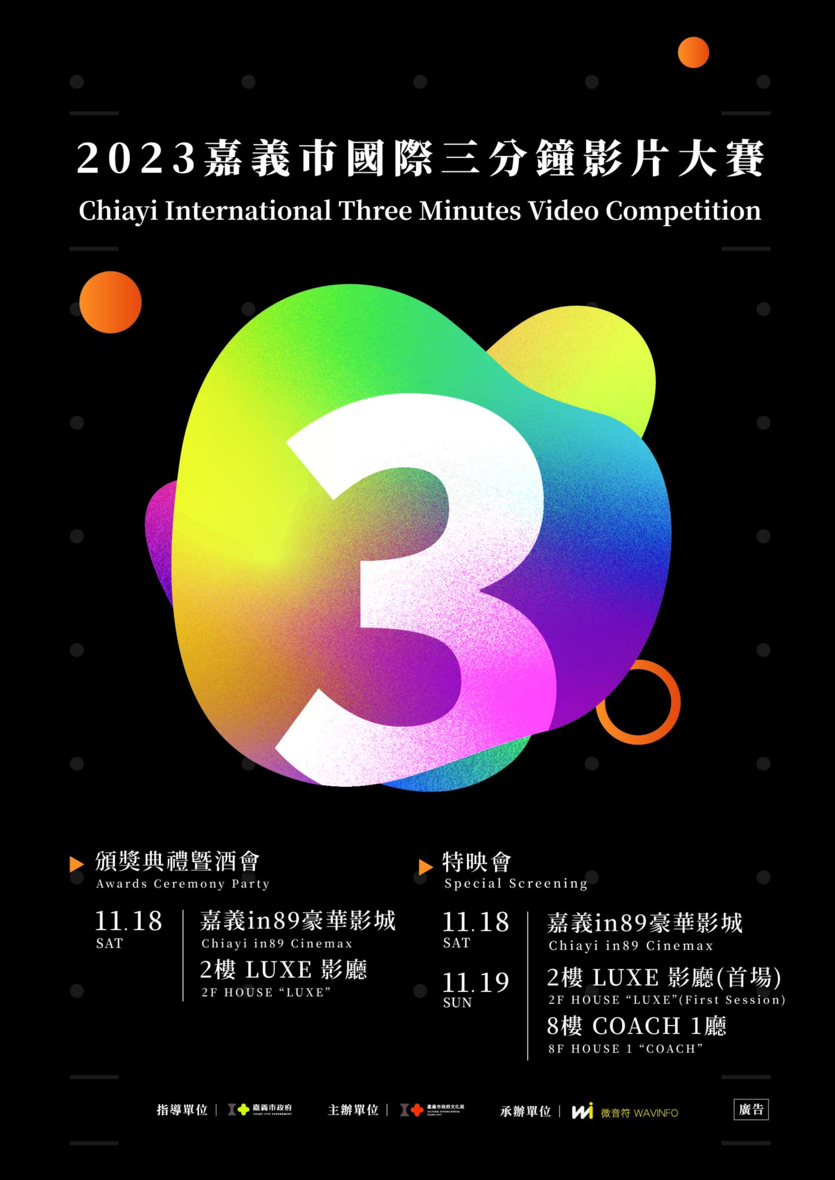 (1)112年11月18日(星期六)15時05分(首場接續頒獎典禮後放映)、18時30分各一場。
