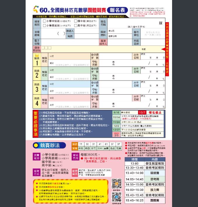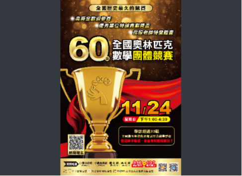 說明: 一、檢附「第60屆全國奧林匹克數學團體競賽」競賽活動相關 簡章,供 貴校參閱。競賽報名的起訖時間為113年9月16 日至113年10月7日止。 二、本競賽主要目的為:增進團隊合作與溝通技巧,並開發兒 童及青少年之腦力,培養其獨立思考的能力,提升其創意 思考,以培養學習數學的興趣。