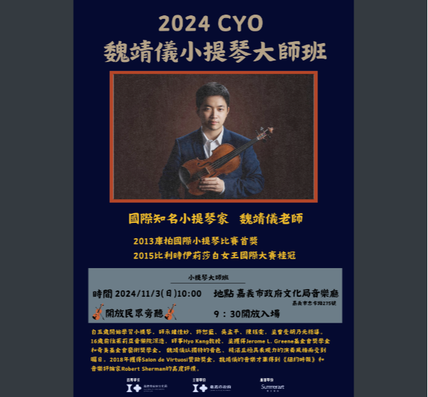 說明: 一、為培訓嘉義市音樂學子,提升專業能力及音樂視野,辦理 期間邀請專業師資,進行專業授課、大師班與相關講座 等,朝向整體質化提升,讓學員都能學有所成,培養學子 的同時也讓嘉義市與國際專業接軌,增添文化交流機會, 累積藝文能量,成為嘉義市的亮點。 二、活動時間為113年11月3日(星期日)上午10時於音樂廳舉 辦。 三、檢附2024嘉義市青年管弦樂團「魏靖儀小提琴大師班」EDM 一份