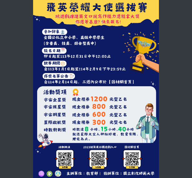 說明: 一、 為提升全國中小學及高級中學學生的英語口說與寫作能 力,教育部『高中英語文口說及寫作遊戲開發與推廣計 畫』推出「SDGs 飛英大使年度排行榜積分賽」,邀請學生 成為「飛英大使」。此遊戲式教材結合SDGs主題影片與互 動任務,幫助學生提升聽力、口說及寫作能力,並鼓勵學 生持續運用該平台素材強化英語學習動機。 二、參賽對象為全國公私立中小學、高級中學(含普高、技高、 綜合型高中)學生。 三、報名期間即日起至113年12月31日(星期二)中午12時止,比賽採先報名後作答制,請參賽者確實填寫報名表,先完 成報名作業。報名網址:https://reurl.cc/qnd76y 四、如有相關問題,請逕洽客服專線。(04)7232105 分機 2573、2574 或電子信箱:admin@sdgsncue.org。