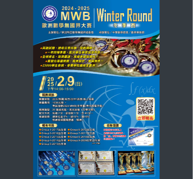 說明: 一、本競賽宗旨為:為提升國內學生數學程度,與國際數學接 軌,發掘優秀人才。 二、本競賽為國際競賽,試題為英文試題,可以準備紙本的英 文字典或一張A4的單字表作為參考。 三、其他詳細比賽資訊可參閱附件