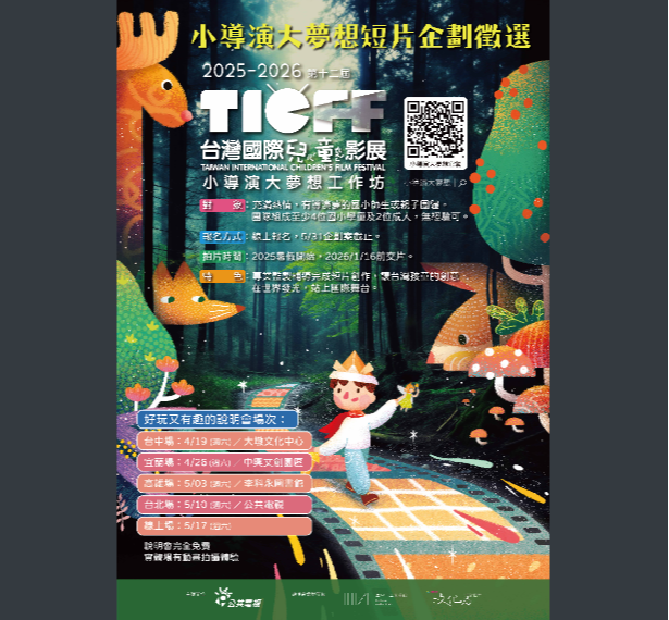 說明: 一、公視為推廣兒少影像教育,透過「小導演大夢想工作坊」 兒童影像教育計畫,號召對影像創作感興趣的國小師生、 親子團隊,先徵件再提供培訓輔導的方式,鼓勵組隊參與 短片創作。歷屆經工作坊輔導所完成優質作品在國內外各 大兒童影展屢獲獎勵肯定,讓台灣兒童創意在國際上綻放 光芒。 二、公視2025「小導演大夢想工作坊」即將開跑,本會將舉辦 「短片創作說明會」說明參加辦法及相關活動內容。說明 會場次為2025/4/19台中大墩文化中心、4/26宜蘭中興文創 園區、5/3高雄李科永圖書館、5/10台北公共電視、5/17線