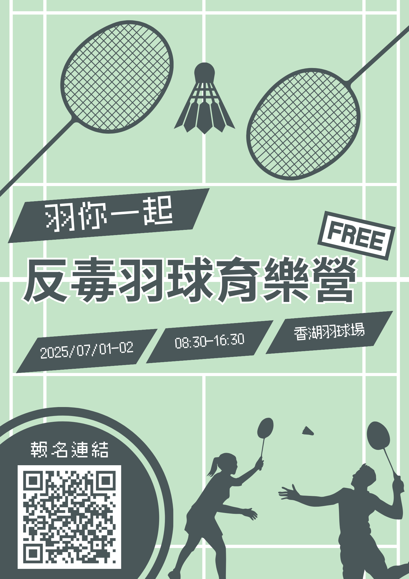 主旨:本局為提升兒少健康休閒意識並加強反毒教育,於114年7月1日至114年7月2日特辦理「羽你一起!反毒羽球育樂營」,請惠予協助公告並鼓勵學生踴躍報名參加。