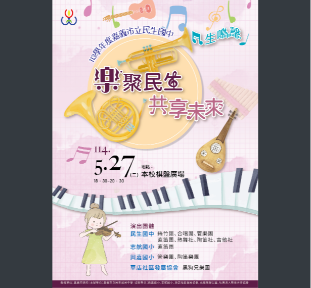 說明: 一、本校將於114年5月27日(星期二)下午18時30分於本校棋盤 廣場舉行,民生鳴聲-「樂聚民生 共享未來」社團成果發 表會暨文藝芳鄰音樂會。 二、演出團隊包含民生國中絲竹團、民生國中管樂團、民生國 中合唱團、民生國中直笛團、志航國小直笛團、興嘉國小 管樂團、興嘉國小陶笛樂團及車店社區發展協會黑狗兄樂 團,竭誠歡迎一同參與。 三、檢附活動海報電子檔,請協助宣傳。