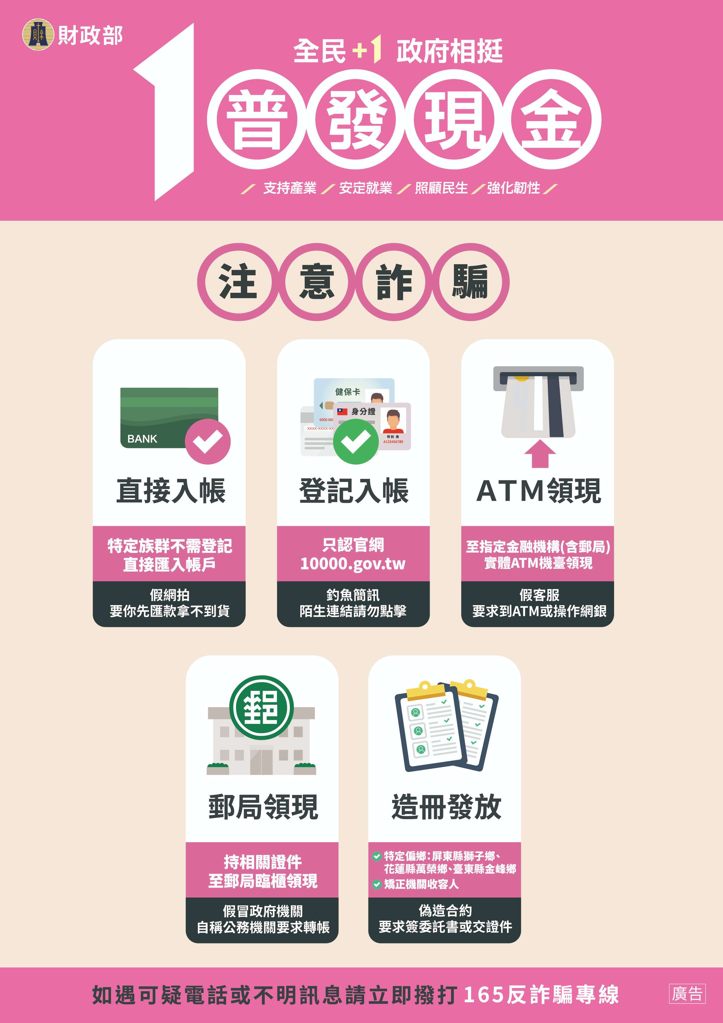 二、財政部「全民+1 政府相挺」普發現金網站已經上線(網 址:https://10000.gov.tw/ ) ,請呼籲教職員工生及家 長採用官網的「登記入帳」方式,快速安全又方便。另, 政府「不會」主動發簡訊或電子郵件通知領錢或登錄,也 「不會」電話要求到ATM或網銀操作轉帳;如遇可疑網站或 訊息,請立即撥打165反詐騙專線。
