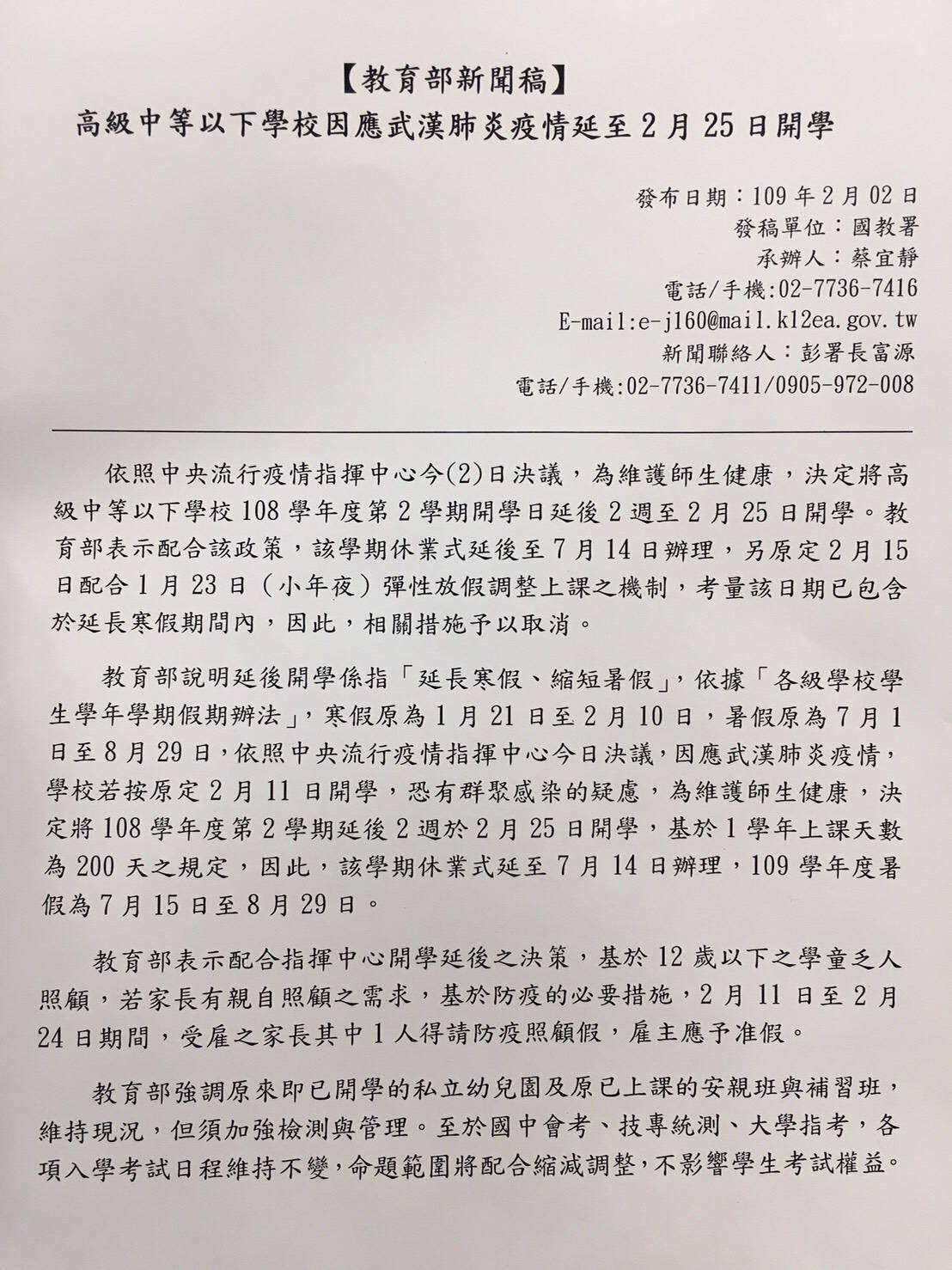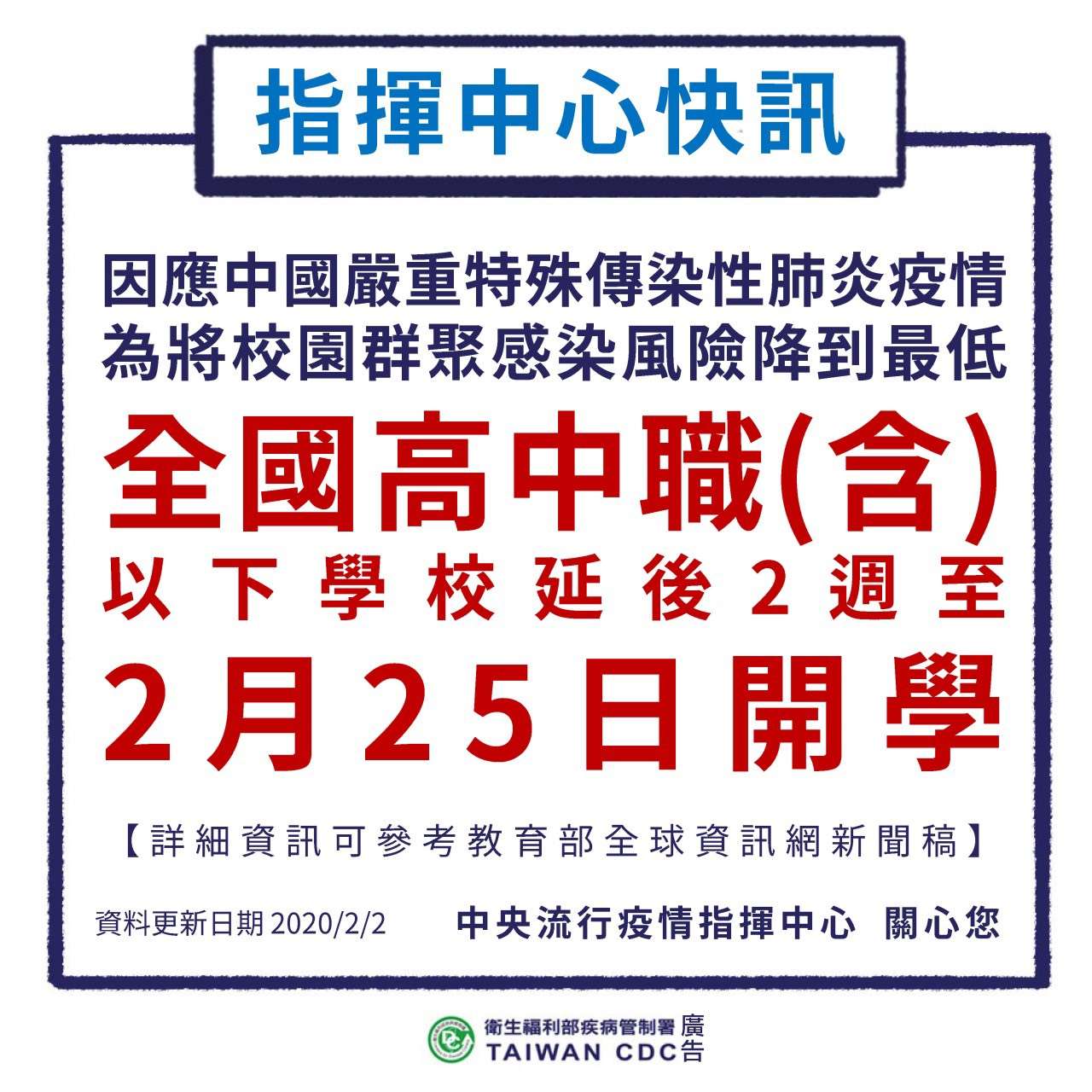 依照中央流行疫情指揮中心今(2)日決議,為維護師生健康,決定將高級中等以下學校108學年度第2學期開學日延後2週至2月25日開學。教育部表示配合該政策,該學期休業式延後至7月14日辦理,另原定2月15日配合1月23日(小年夜)彈性放假調整上課之機制,考量該日期已包含於延長寒假期間內,因此,相關措施予以取消。