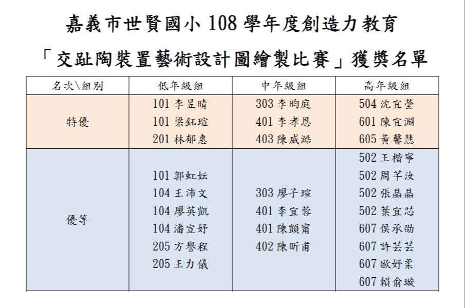 本校108學年度創造力教育「交趾陶裝置藝術設計圖繪製比賽」獲獎名單詳如附件。