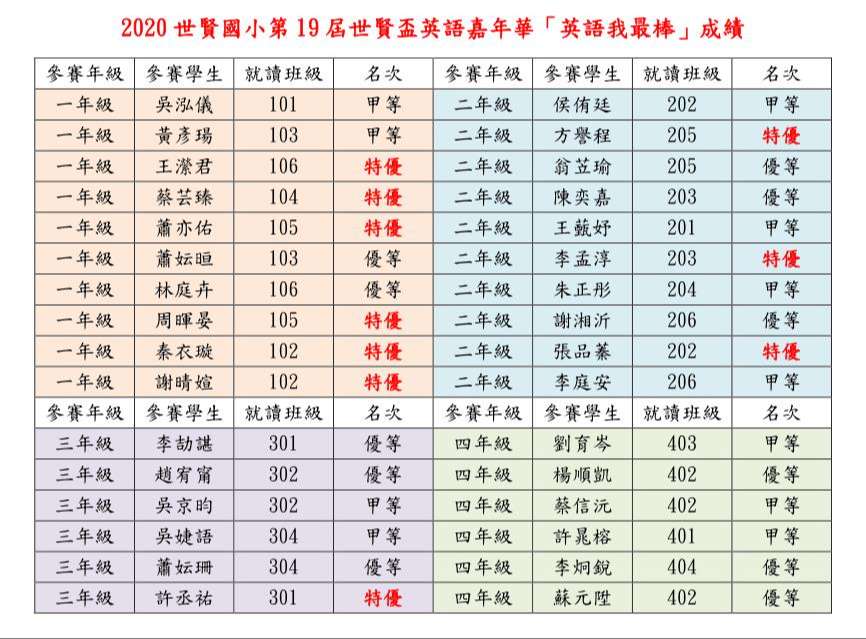 本校第19屆世賢盃「英語嘉年華」之「英語我最棒」及「英語千字王」獲獎名單詳如附件。
