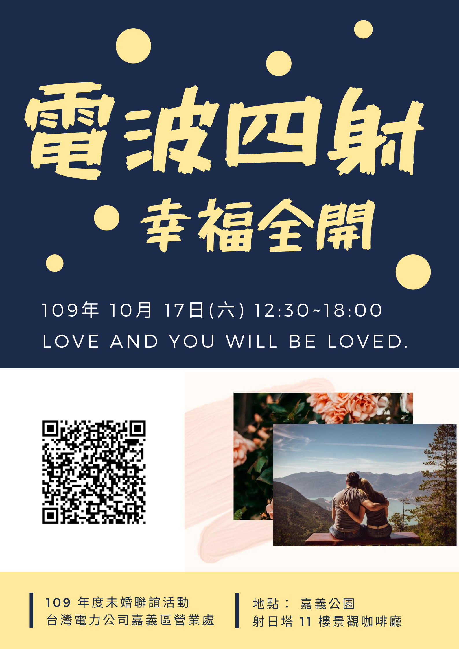 主旨:轉知台灣電力股份有限公司嘉義區營業處109年度「電波四射,幸福全開」未婚聯誼活動,請單身員工踴躍報名參加,詳如說明,請查照。