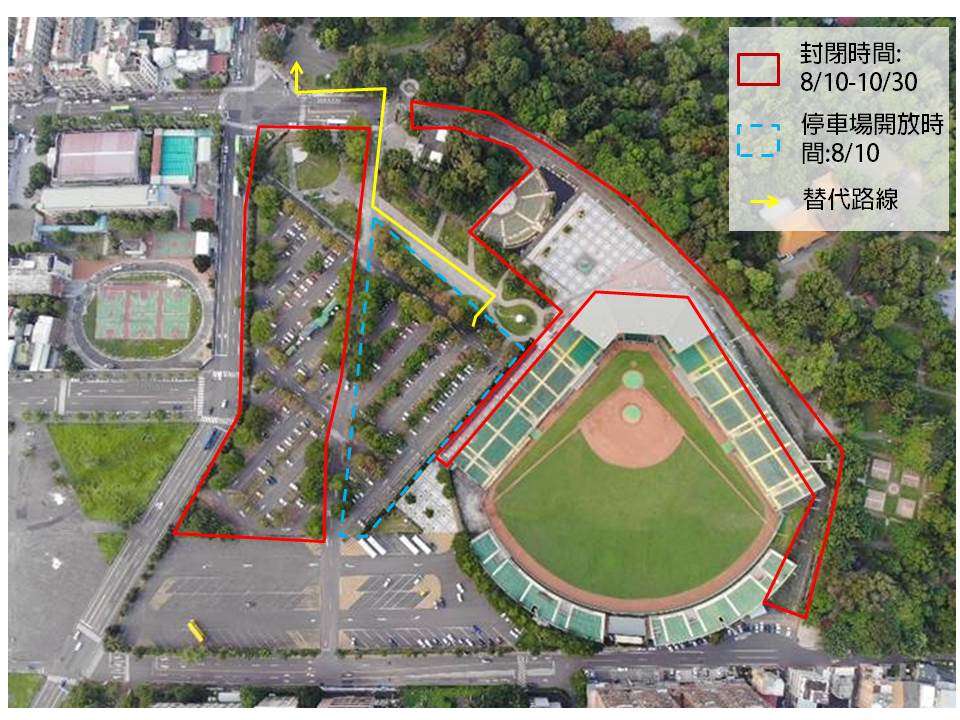 二、嘉義市政府為辦理「步行散策‧樂活水岸」工程,市立棒球場與嘉義公園間人行道,預計於109年8月10至10月30日封閉施工。工區場域封閉情況及期程如附件說明。
