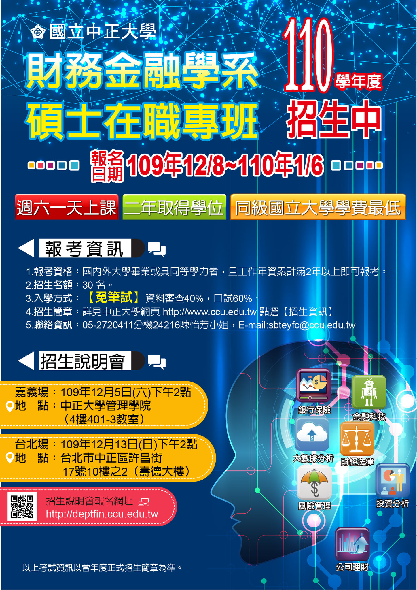 主旨:轉知國立中正大學財務金融學系碩士在職專班110學年度招生宣傳海報,請查照。