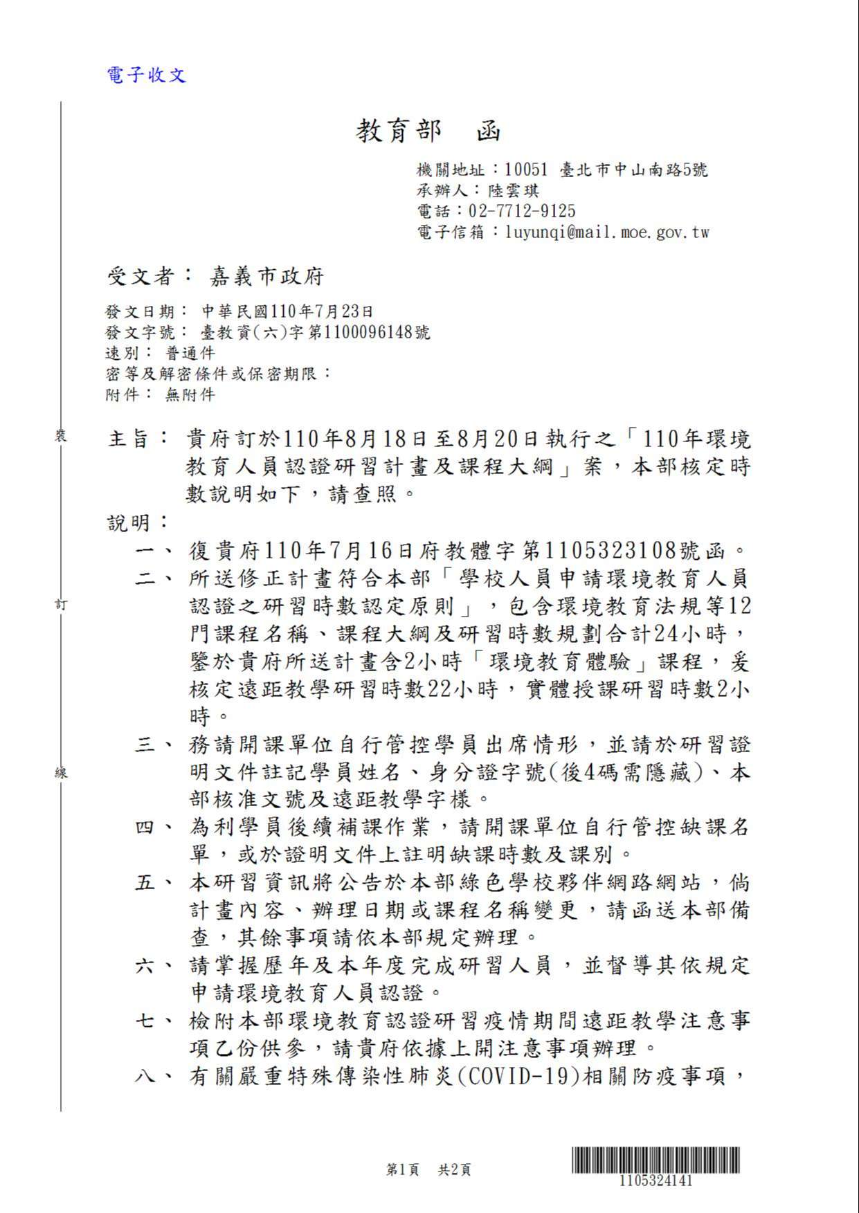主旨:檢送本市「110年環境教育人員認證研習計畫」1份(如附件),請各校派員並逕依權責核予公(差)假,請查照。