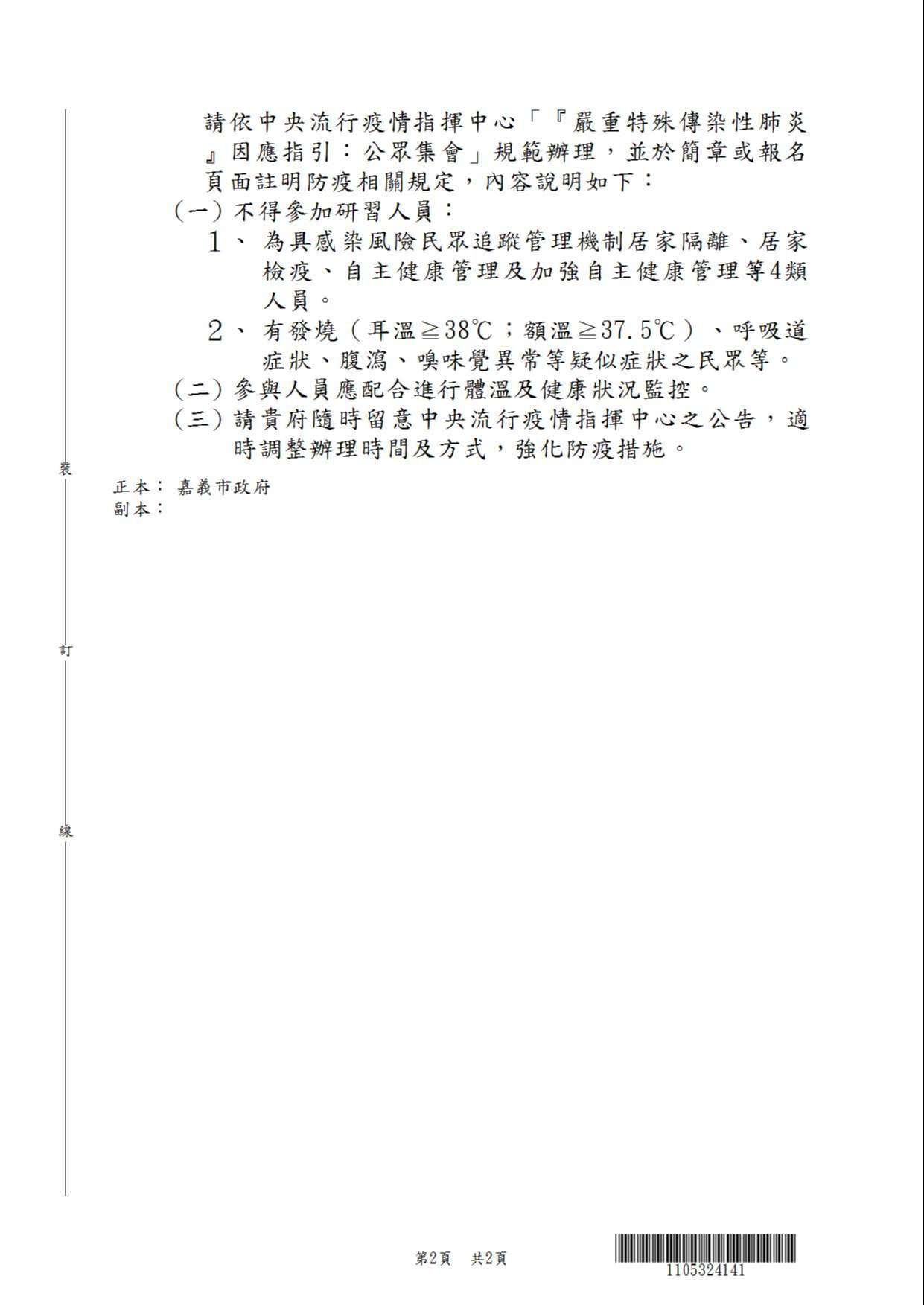 三、有關嚴重特殊傳染性肺炎(COVID-19)相關防疫事項,請依中央流行疫情指揮中心「『嚴重特殊傳染性肺炎』因應指引:公眾集會」規範辦理,並於簡章或報名頁面註明防疫相關規定如下: