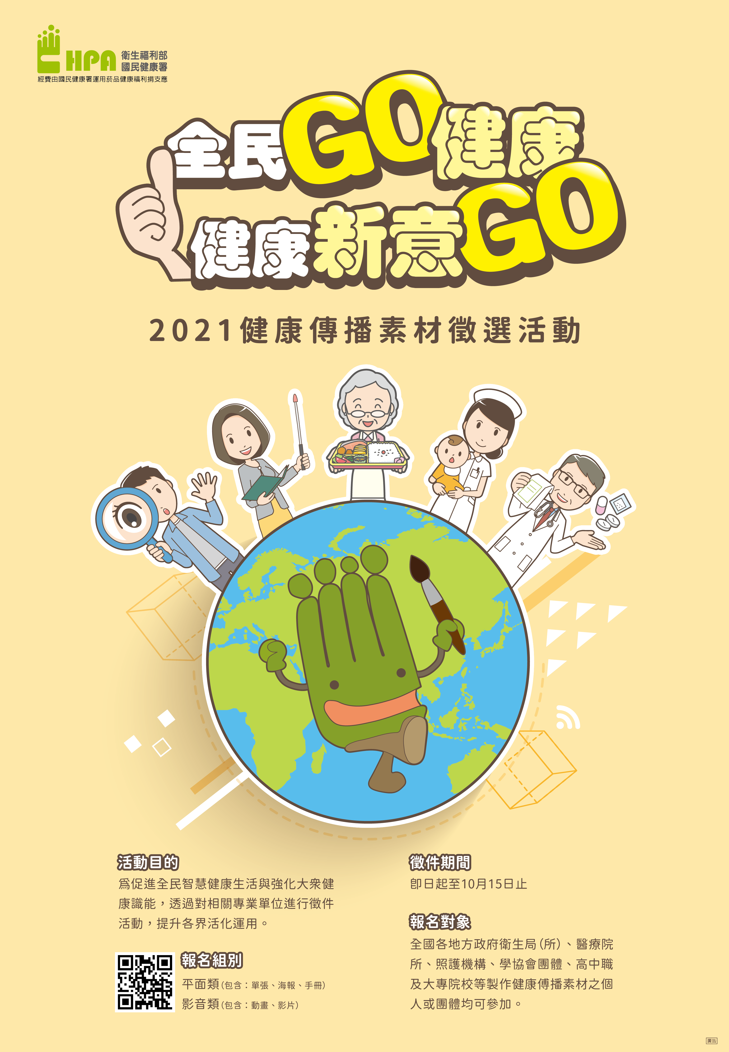 主旨:函轉衛生福利部國民健康署辦理「2021全民GO健康 健康新意GO-健康傳播素材徵選活動」簡章及海報電子檔(如附件),請各校踴躍報名參加,請查照。