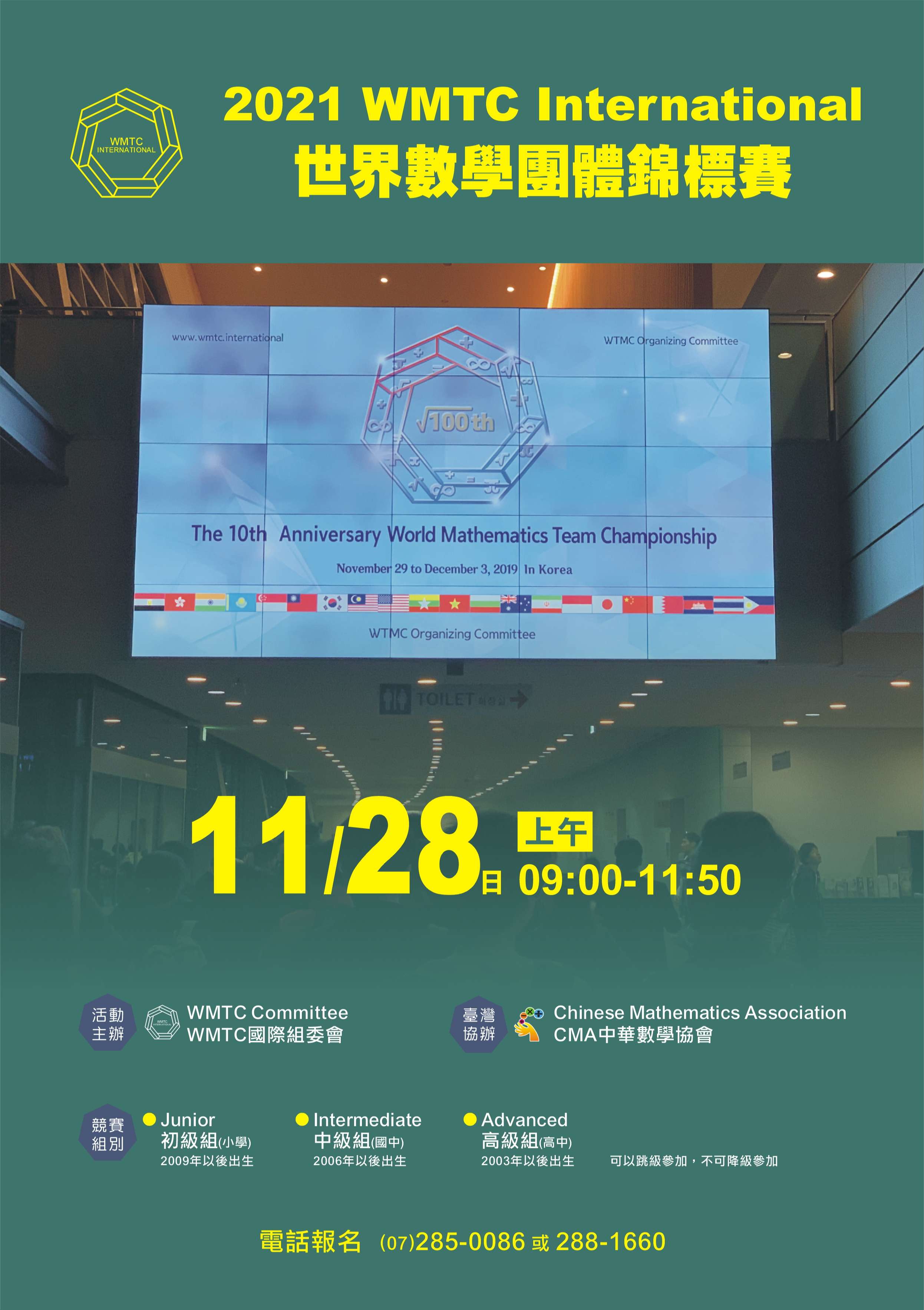 本會為推廣國小、國中至高中之數理教育,謹訂於110年11月28日(日)承辦 「WMTC International世界數學團體錦標賽」,旨在培養學童對數理的興趣,為國家培育優秀人才。WMTC國際組委會已授權中華數學協會開放各級學校申請特約考場,建請 貴校公告並推薦學生參加競賽,以提升數理教育,歡迎共襄盛舉。
