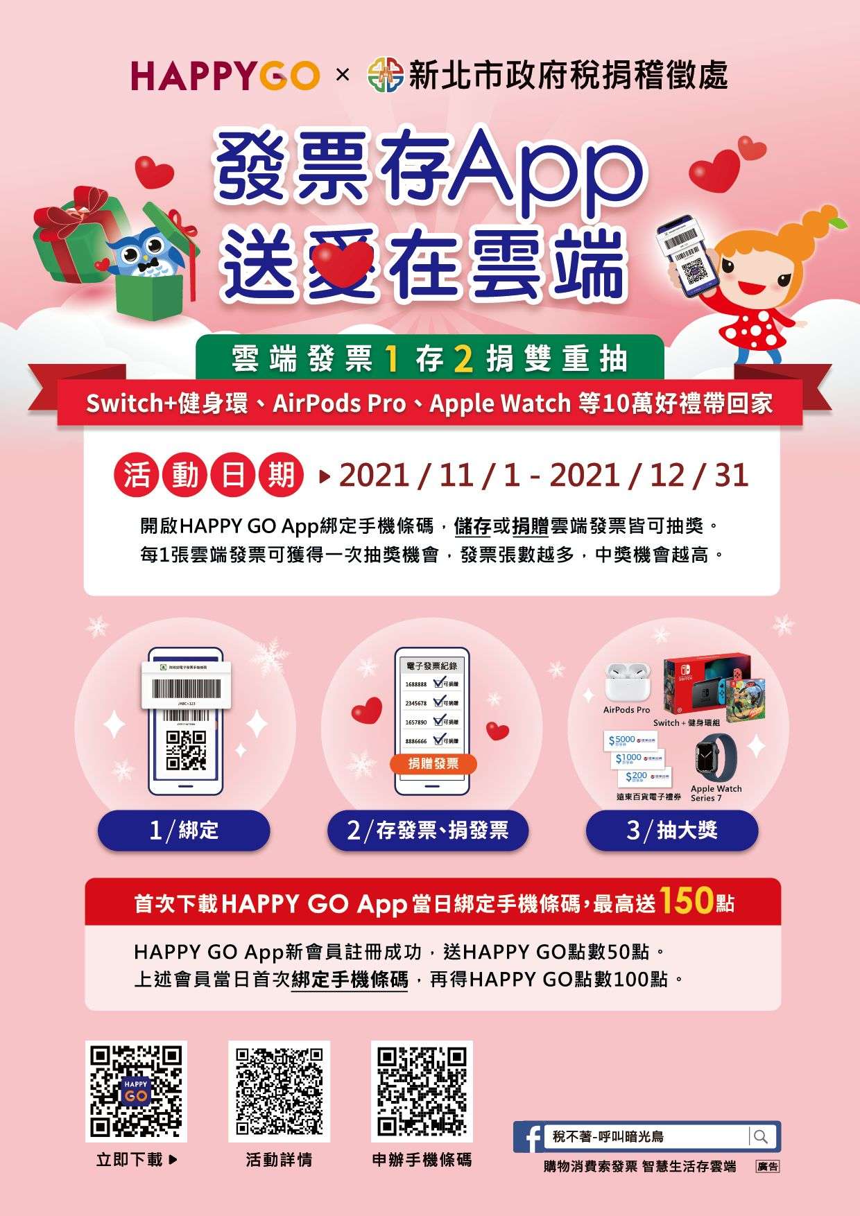 三、活動詳情請上「稅不著—呼叫暗光鳥」粉絲專頁(https://www.facebook.com/ntpctax/)或活動網站(https://event.happygocard.com.tw/app/event/event2021_NTPinvoice_part3.html)查詢。