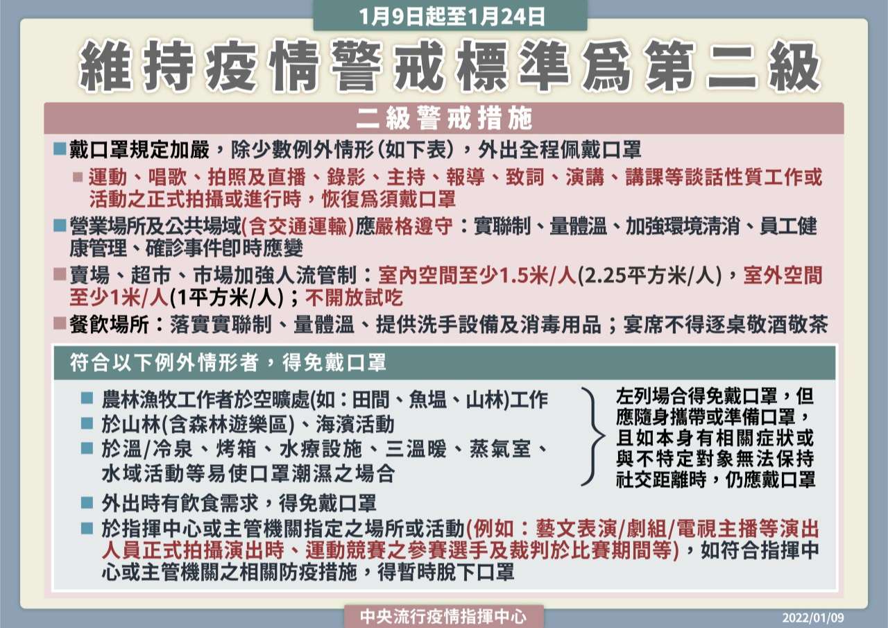 主旨:嚴重特殊傳染性肺炎中央流行疫情指揮中心(以下簡稱指揮中心)宣布,自111年1月9日至1月24日維持疫情警戒標準為第2級,並請落實相關防疫措施,請查照。