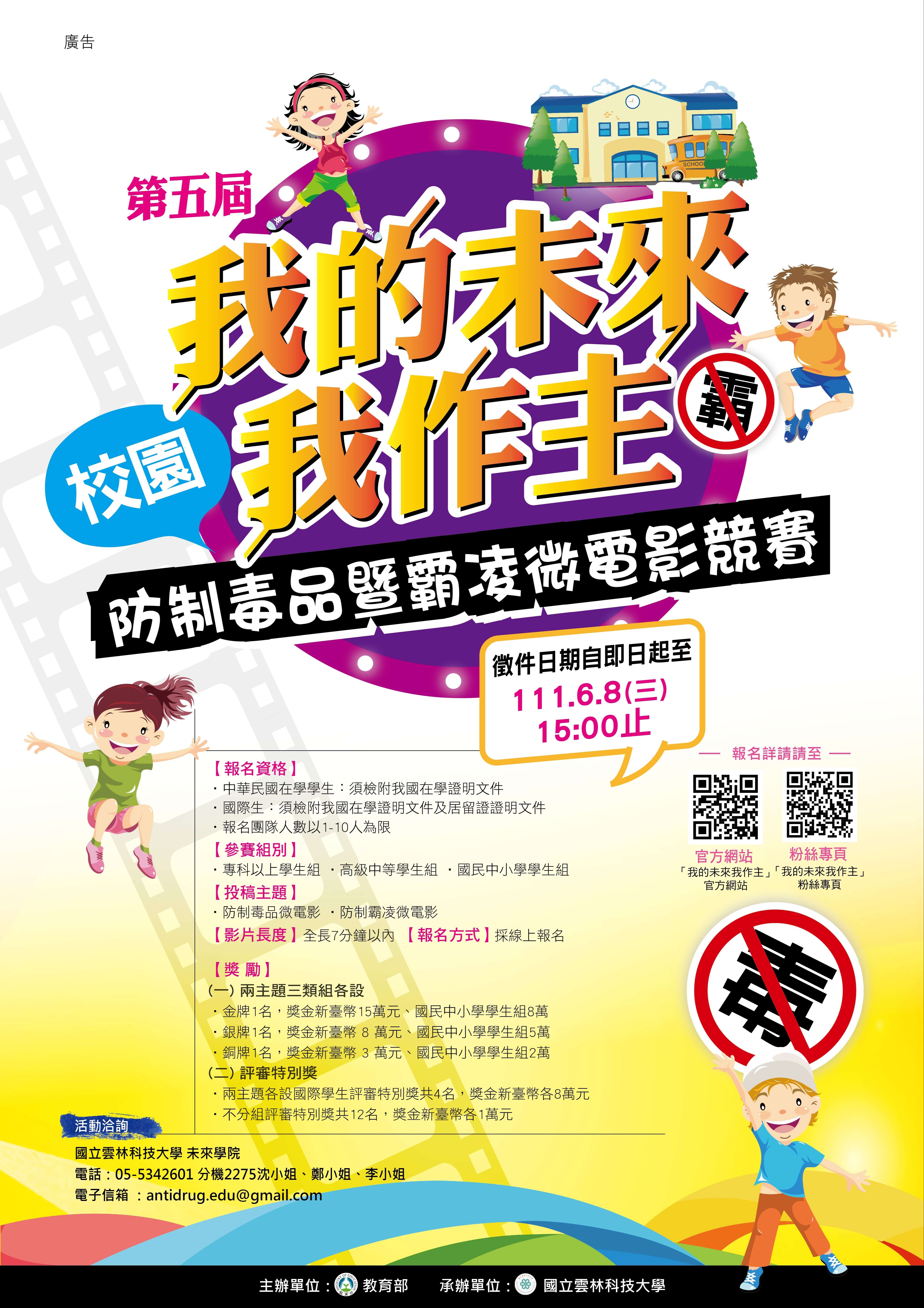 四、請貴校協助徵件宣導,詳細競賽資訊請見「我的未來我作主」官方網站(www.antidrug.tw/)、臉書粉絲專頁(www.facebook.com/antidrug.edu/),或洽詢承辦單位,電話:(05)534-2601#2275。