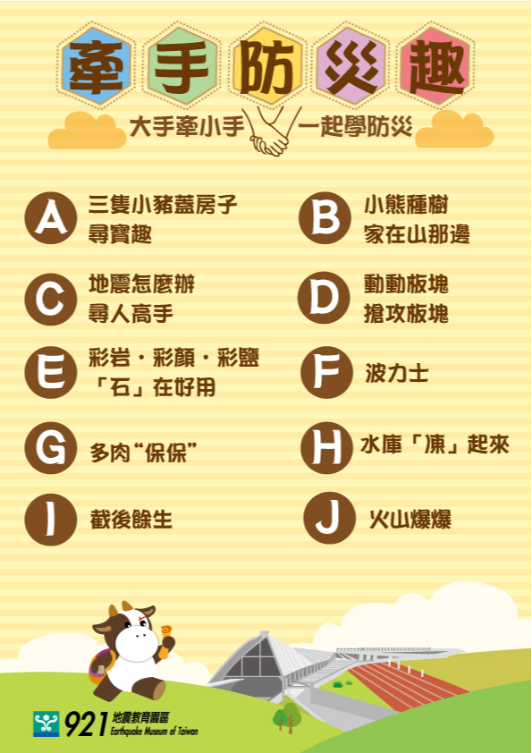 一、該園區致力於推廣地震科學、建築安全與防災教育工作,於暑假規畫辦理「牽手防災趣」到校服務活動,透過套裝課程,帶領大家從多元主題來認識地震與防災,活動資訊如下: