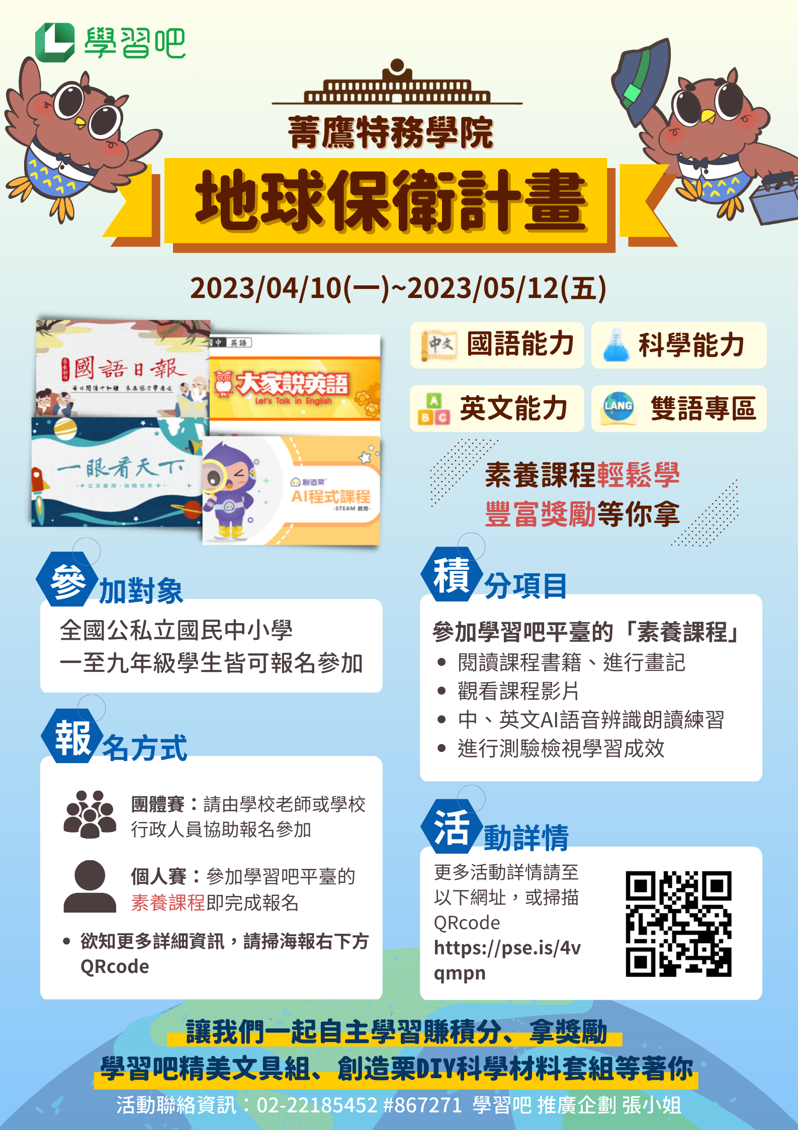 主旨:為提升學生跨域理解與應用能力,學習吧LearnMode教育平臺訂於112年4月10日至5月12日辦理「菁鷹特務學院-學生線上學習活動」,請鼓勵所屬師生報名參加,請查照。
