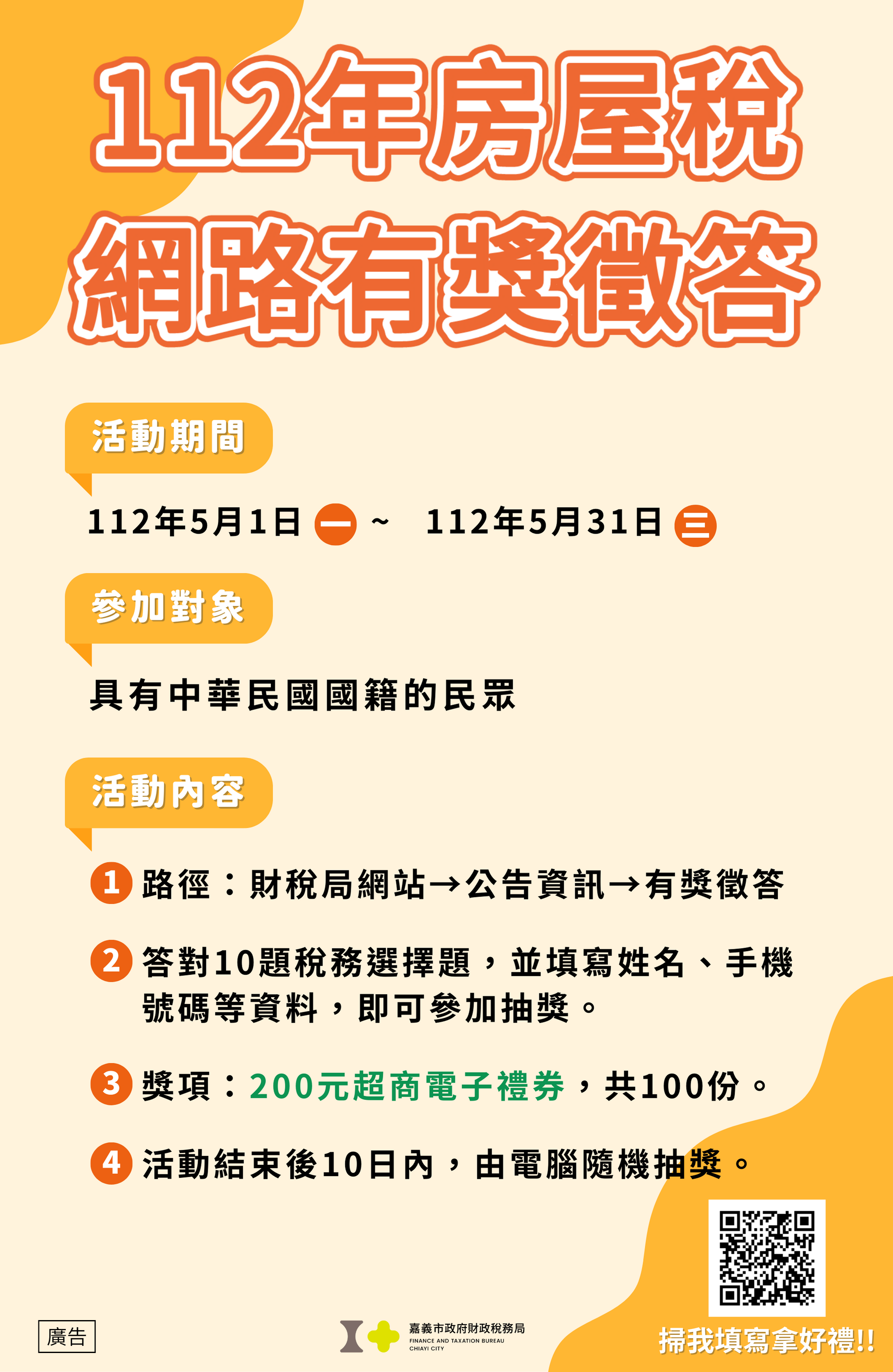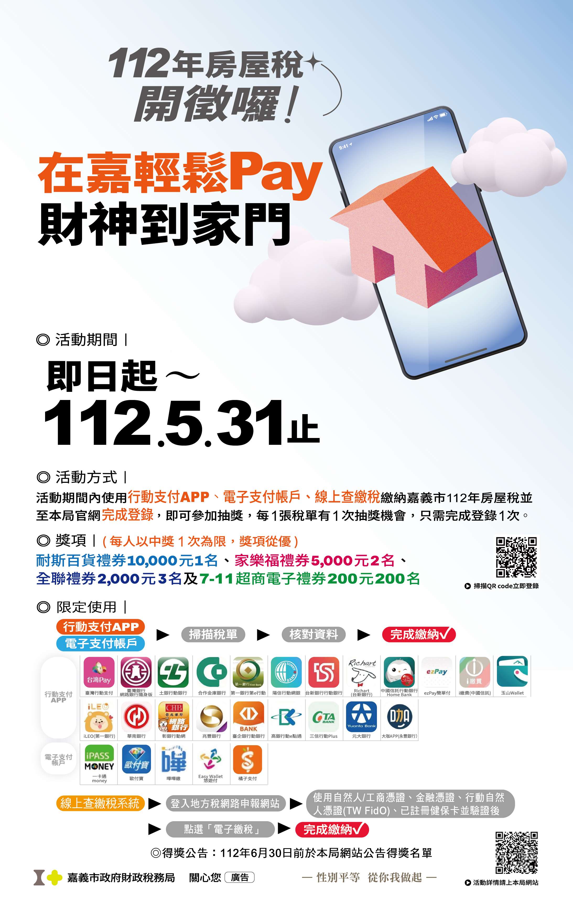 本局於112年房屋稅開徵期間(5月1日至31日)舉辦「在嘉輕鬆Pay 財神到家門」和網路有獎徵答活動(網址:http://www.citax.gov.tw)