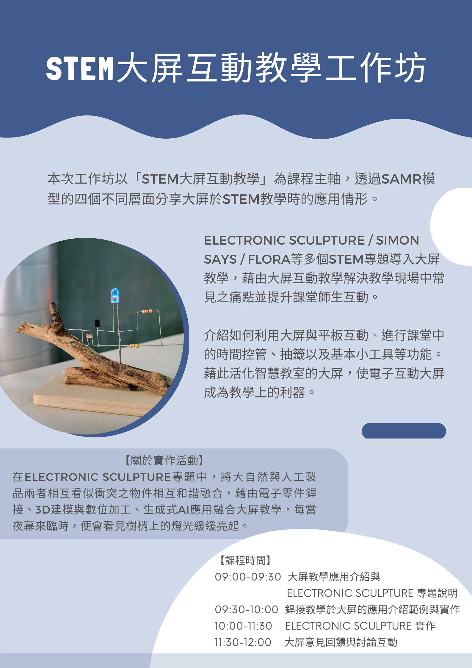 主旨:檢送本市玉山科技中心辦理「STEM大屏互動教學工作坊:電路雕塑」教師增能研習實施計畫(如附件),請轉知貴校教師並鼓勵參加。
