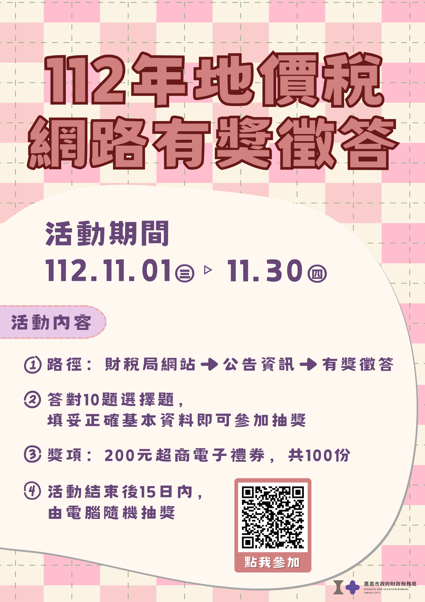 主旨:本局於112年地價稅開徵期間(11月1日至30日)舉辦「便利e繳稅 好禮來嘉Pay」及網路有獎徵答活動(網址:http://www.citax.gov.tw),請惠予轉知貴校師生踴躍參加並將活動訊息公告於貴校網頁,及協助利用電子看板(跑馬燈)播送宣導標語3則,請查照。