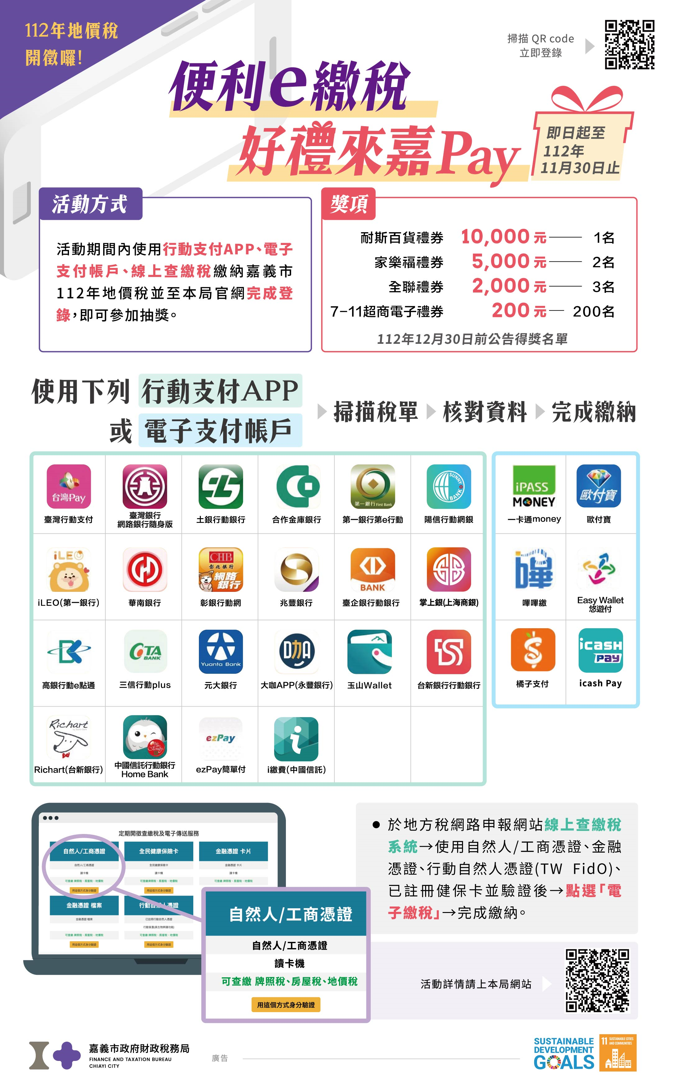 (三)「便利e繳稅 好禮來嘉Pay」,11月30日前以行動支付APP、電子支付帳戶、線上查繳稅成功繳納並至市府財稅局網站完成登錄即可參加抽獎。