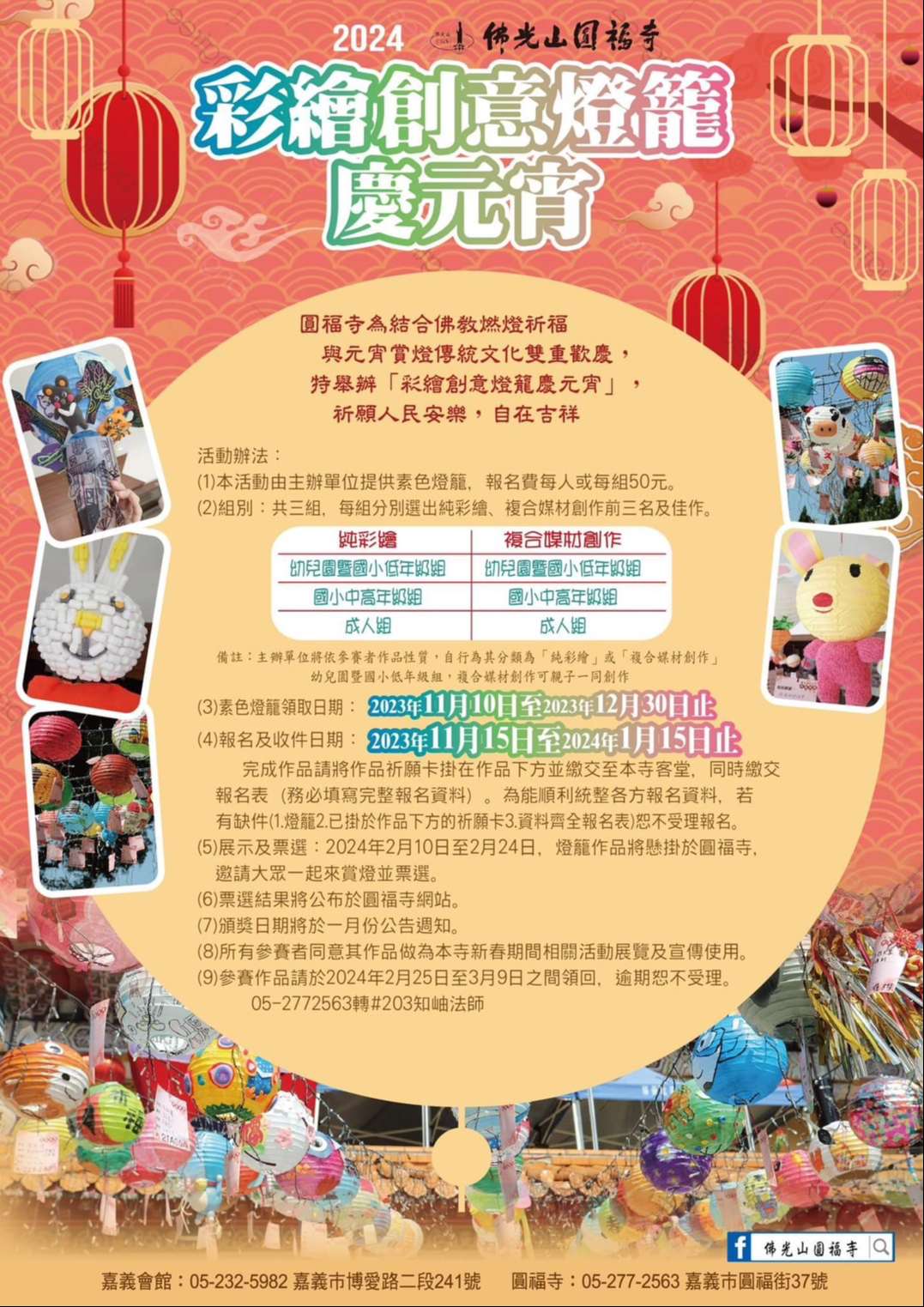 圓福寺舉辦創意燈籠活動,歡迎踴躍參加!今年組別分為3組:幼兒暨國小低年級組、國小中高年級組,另新增一組成人組。敬邀老師、同學們一起來參與。若有任何問題,可來電洽詢05-2772563 知岫法師,謝謝您