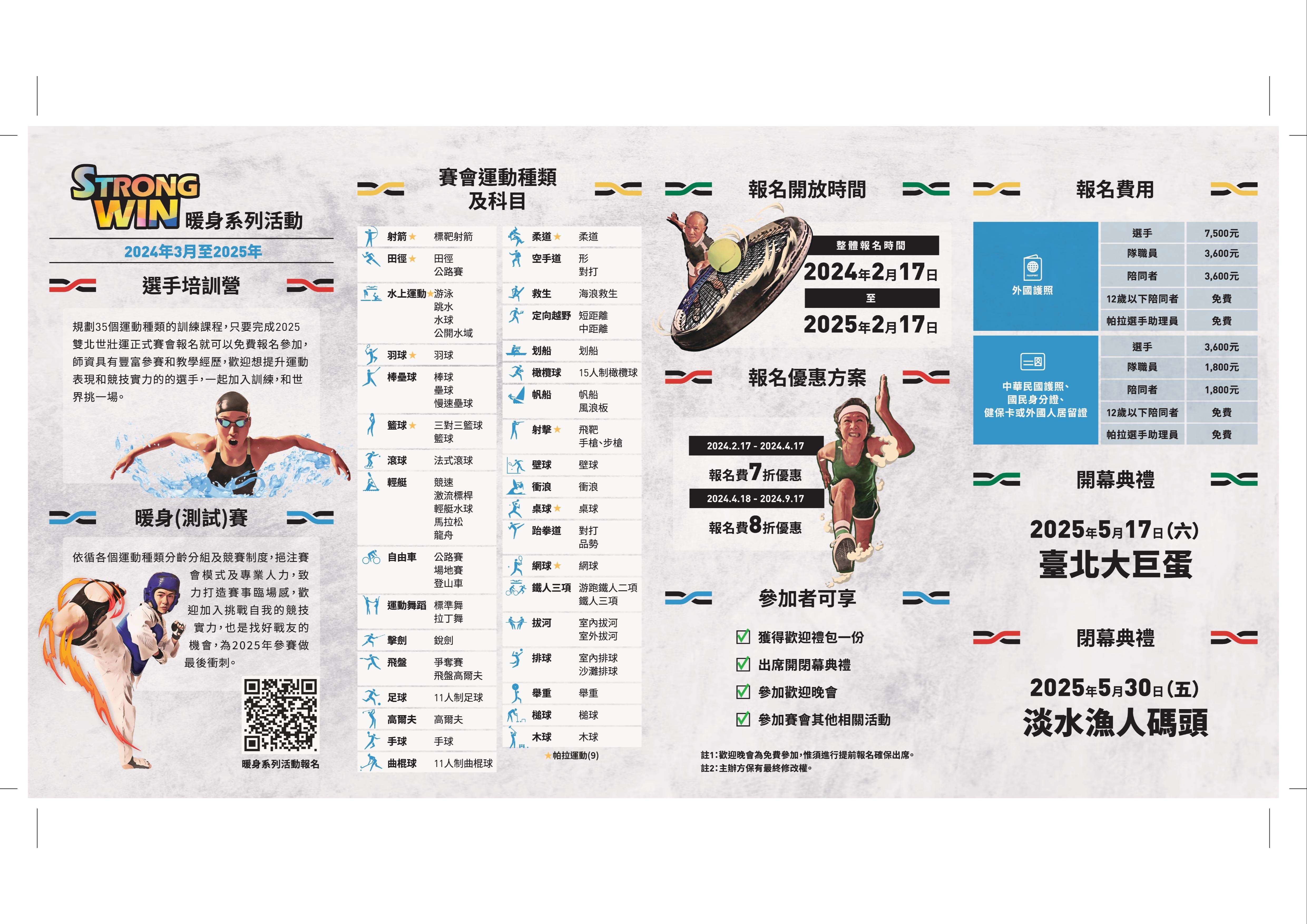 (二)報名費用:詳見官方網站(https://wmg2025.tw/)首頁/報名資訊/報名費用,113年2月17日至113年4月17日報名享早鳥優惠7折,113年4月18日至113年9月17日報名享早鳥優惠8折。