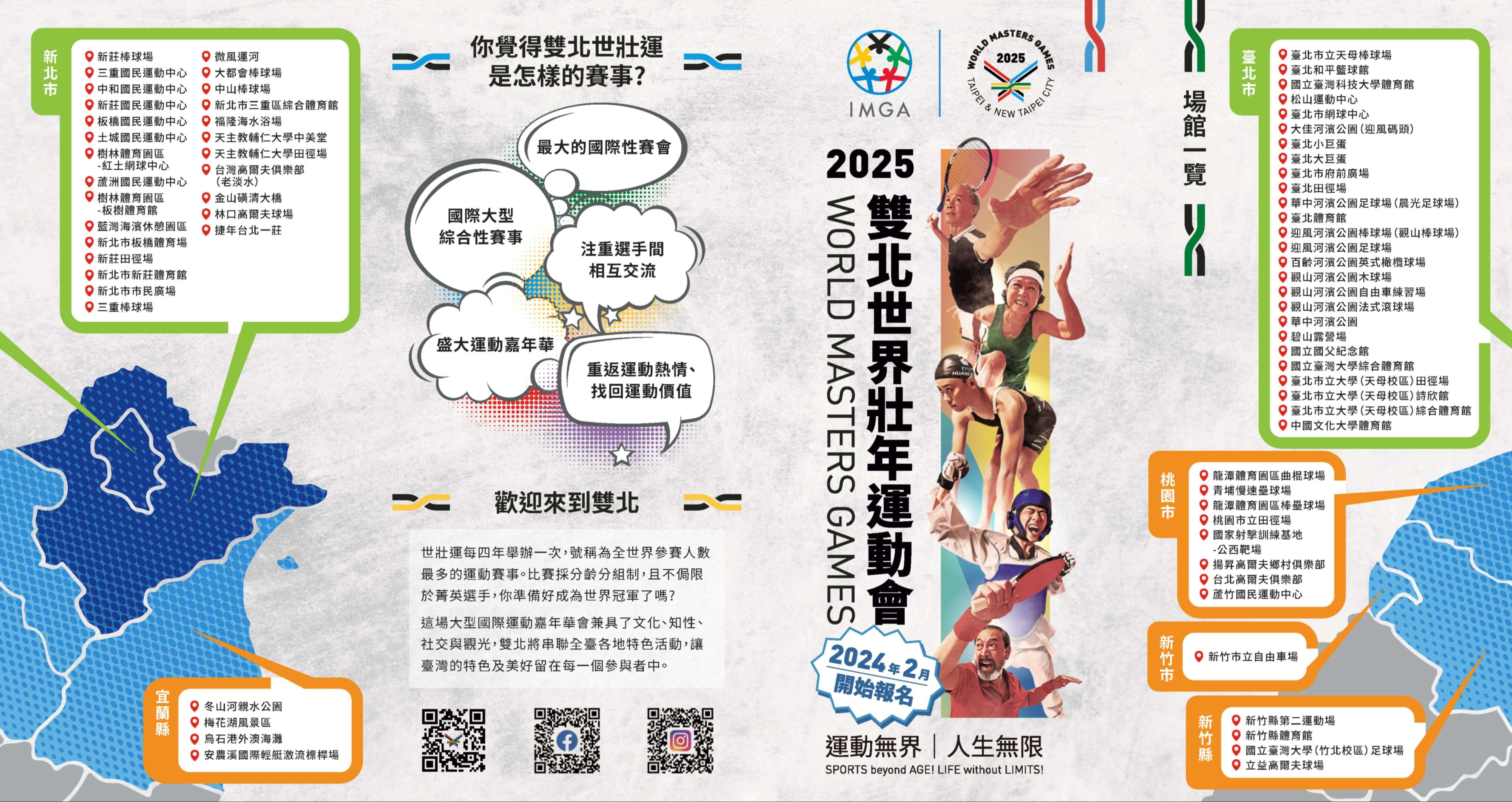 二、旨揭賽會由國際壯年運動總會(IMGA)主辦,臺北市政府與新北市政府共同承辦,預計114年5月17日至30日於臺北市、新北市、宜蘭縣、桃園縣、新竹縣市等6縣市辦理,共有35種運動種類、283項運動項目(含性別、分級及年齡組共計11,688小項)。世界壯年運動會自1985年舉辦第1屆以來,每4年舉行1次,開放全球30歲以上愛好運動的人士報名參加。