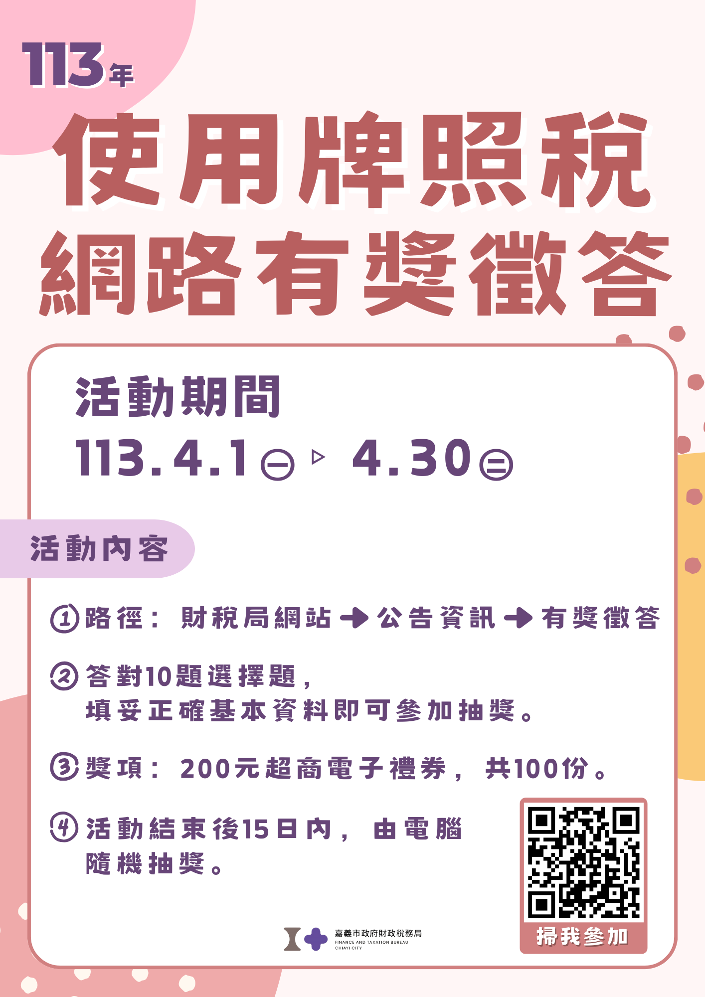 主旨:本局於113年使用牌照稅開徵期間(4月1日至30日)舉辦「e起支付Pay 來嘉抽好禮」及網路有獎徵答活動(網址:http://www.citax.gov.tw),請惠予轉知貴校師生參加,並協助將活動訊息公告於貴校網頁及協助利用電子看板(跑馬燈)播送宣導標語3則,請查照。