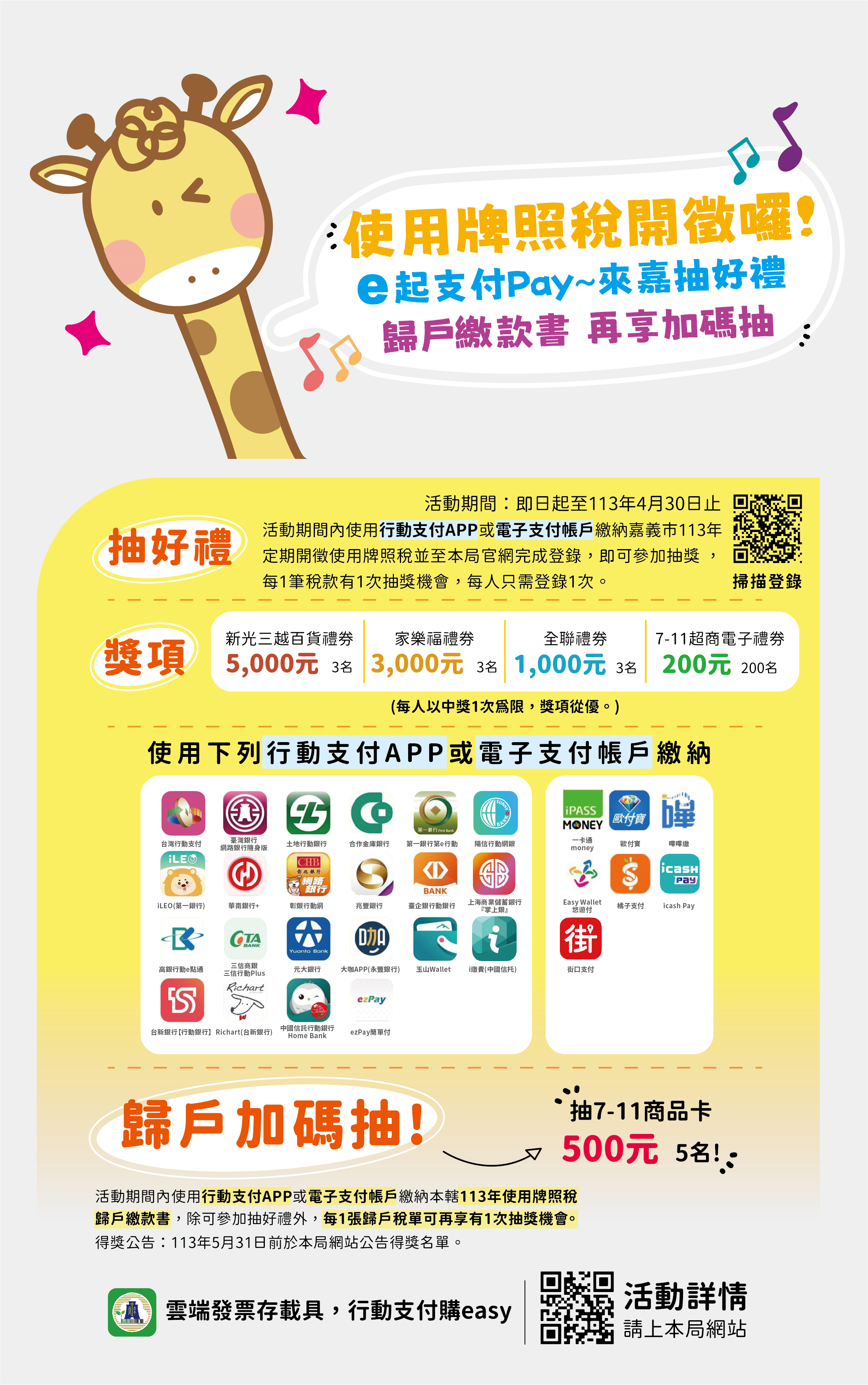 (三)「e起支付Pay 來嘉抽好禮」,4月30日前以行動支付或電子支付繳納本市開徵使用牌照稅並至市府財稅局網站完成登錄即可參加抽獎,已歸戶繳款書再享加碼抽;新申辦歸戶好禮送。