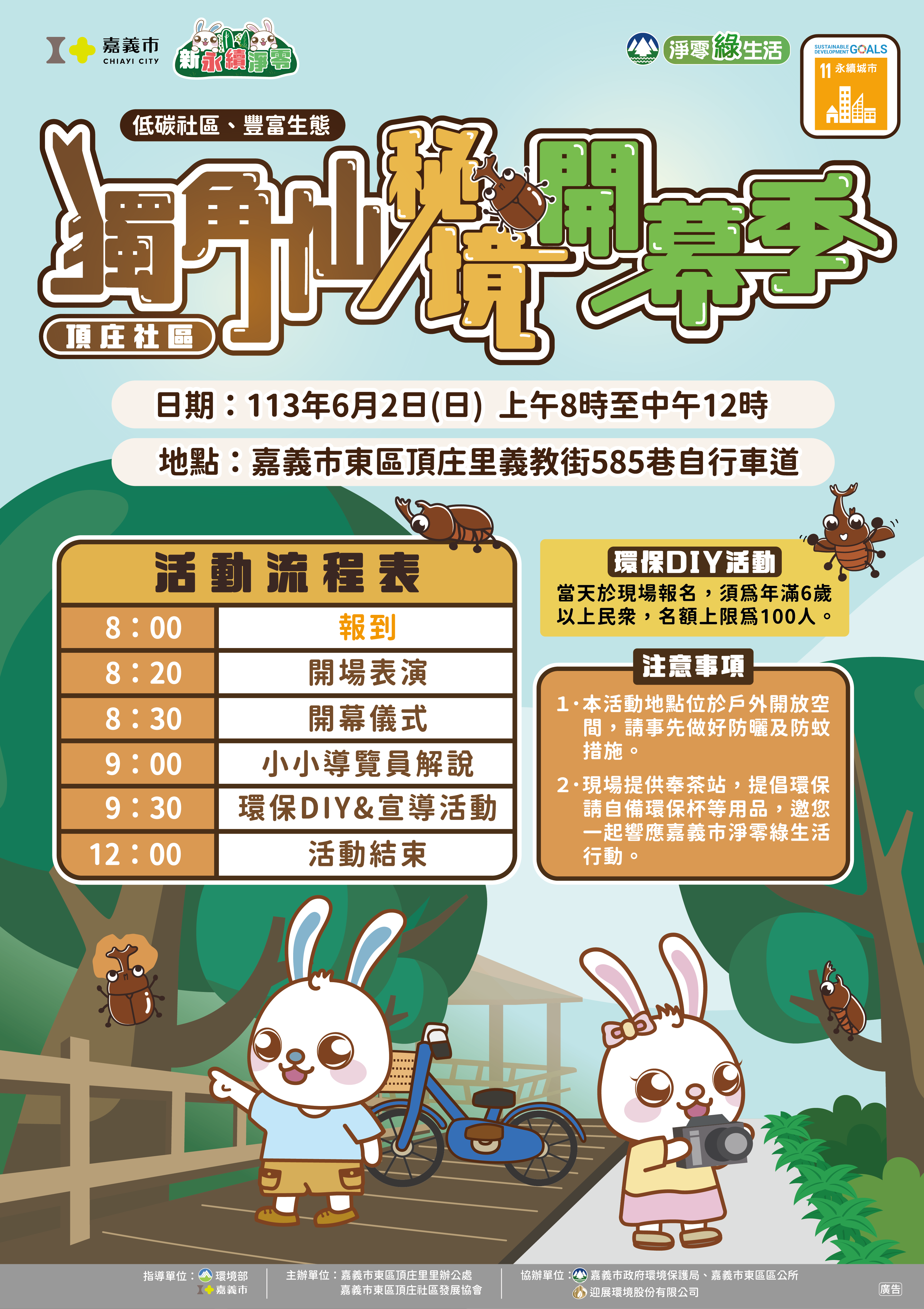 說明: 一、活動時間:113年6月2日(星期日)上午8時至12時。 二、活動地點:頂庄里自行車道(嘉義市東區頂庄里義教街585巷)。