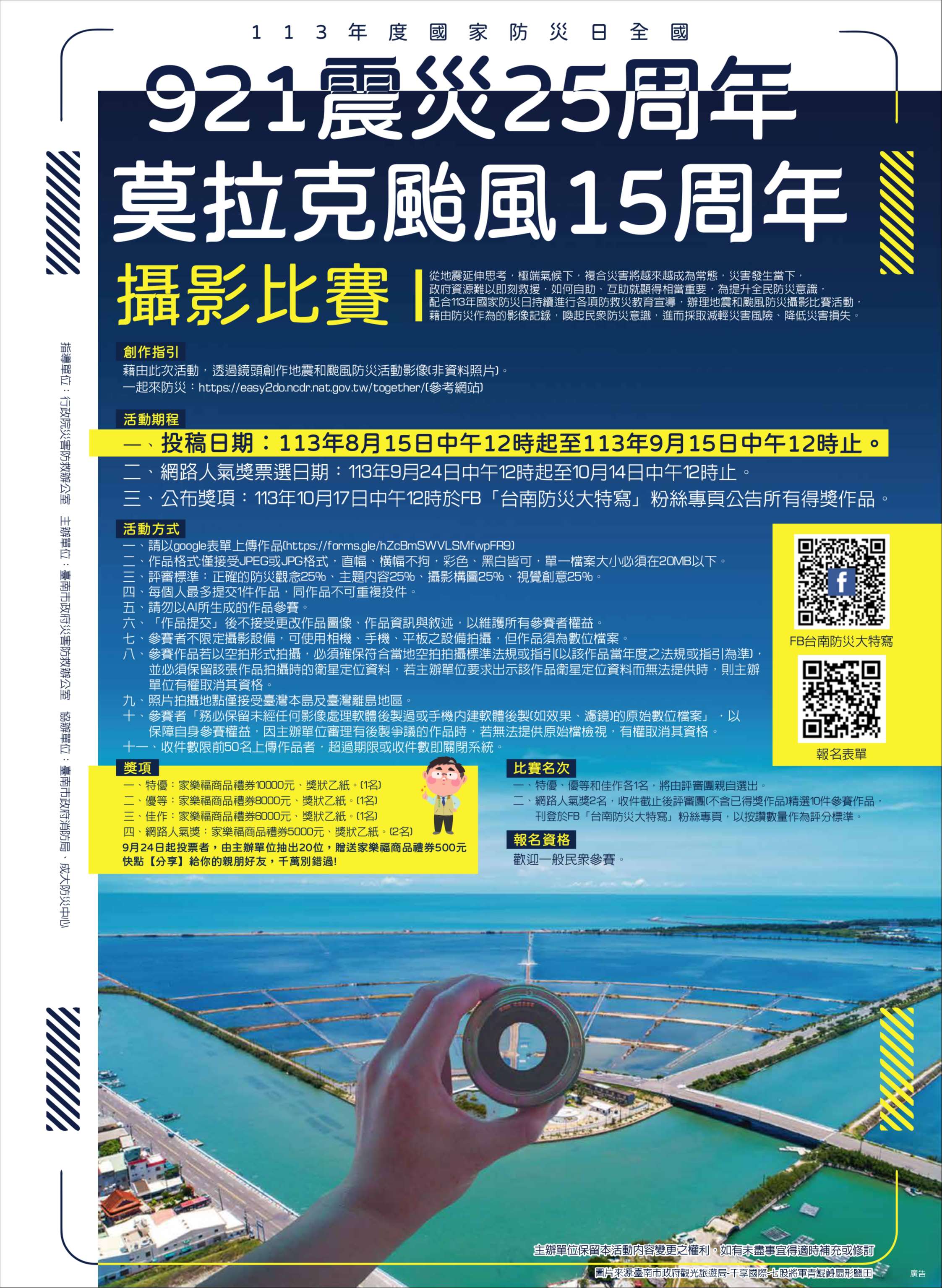 主旨:函轉臺南市為提升全民防災意識,訂於113年8月15日起辦理全國「921震災25周年,莫拉克颱風15周年攝影比賽」活動。
