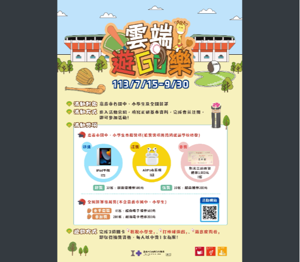 主旨:檢送本局舉辦113年「雲端遊go樂」網路闖關活動海報電 子檔1份,請貴校協助於官網、LINE、臉書等多元管道宣 傳或利用電腦課協助學生參加,請查照。