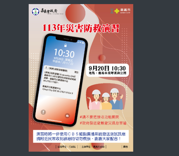 宣導標語內容:嘉義市113年災害防救演習訂於9月20日上午10時至12時舉辦,期間為符合實際災況結合發送災防告警細胞廣播服務訊息演練,發布地點在本市西區大同路320號港坪運動公園一帶,屆時手機如有收到告警訊息請不要驚慌。協助宣導播送期間自即日起至113年9月20日12時