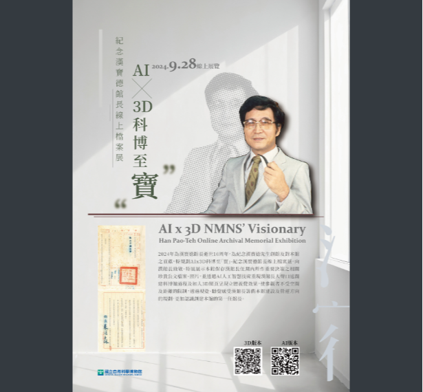 說明: 一、依據國立自然科學博物館113年9月25日館秘字第 1130009089號函辦理。 二、旨揭展覽資訊如下: (一)期間:113年9月28日至113年12月31日。 (二)網址:https://web3.nmns.edu.tw/Exhibits/113 /HptArchives/ 三、旨揭展覽設計為雙網頁之AI版本及3D版本,以AI人聲技術 與3D立體展示,呈現創新的數位文化體驗。歡迎家長及師 生至該館人類文化廳服務台掃描檔案展QR CODE領取3D眼 鏡,於線上觀展體驗3D立體影像視覺效果。 四、檢附線上檔案展海報電子檔1份。