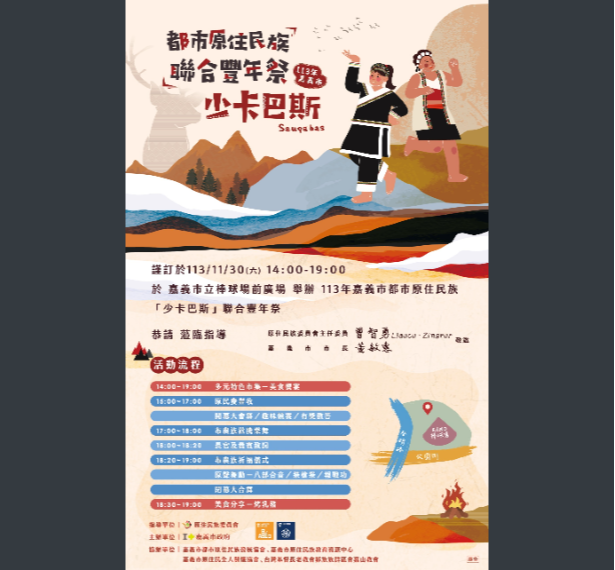 說明: 一、本活動係本市都市原住民族一年一度之盛事,每年以原住 民族祭典儀式及文化歌舞演出為活動主軸,並結合本市原 住民產業行銷、美食及文創市集等方式辦理,期能藉以推 廣本市多元文化,培養對原住民傳統文化的尊重包容。 二、旨揭活動資訊如下: (一)活動時間:113年11月30日(星期六)下午2時至晚上7時 止。 (二)活動地點:嘉義市立棒球場前廣場。 三、請貴機關單位惠予協助張貼電子海報文宣,廣為宣傳共襄 盛舉。 四、檢附本活動宣傳海報1份(如附件)